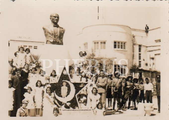 Mustafa Kemal ATATÜRK Büstü Önünde Çiçekli Himaye-i Etfal Amblemi, Ressam Behçet Gürcan, İzciler ve Çocuklar, 9x6 cm
