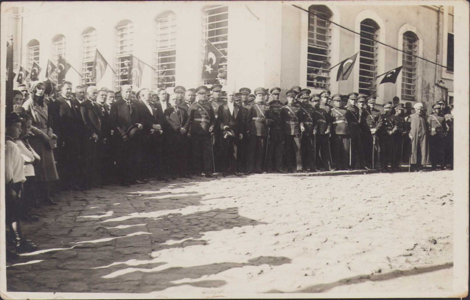 Giresun'da bir resmi tören heyeti toplu fotoğraf, bayrak ve sarıklı beyefendi detaylı, Foto Güzin