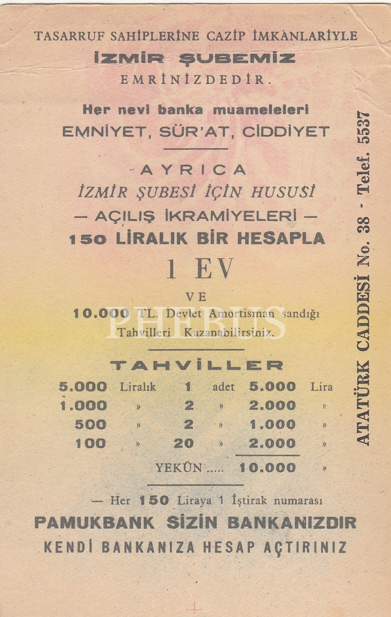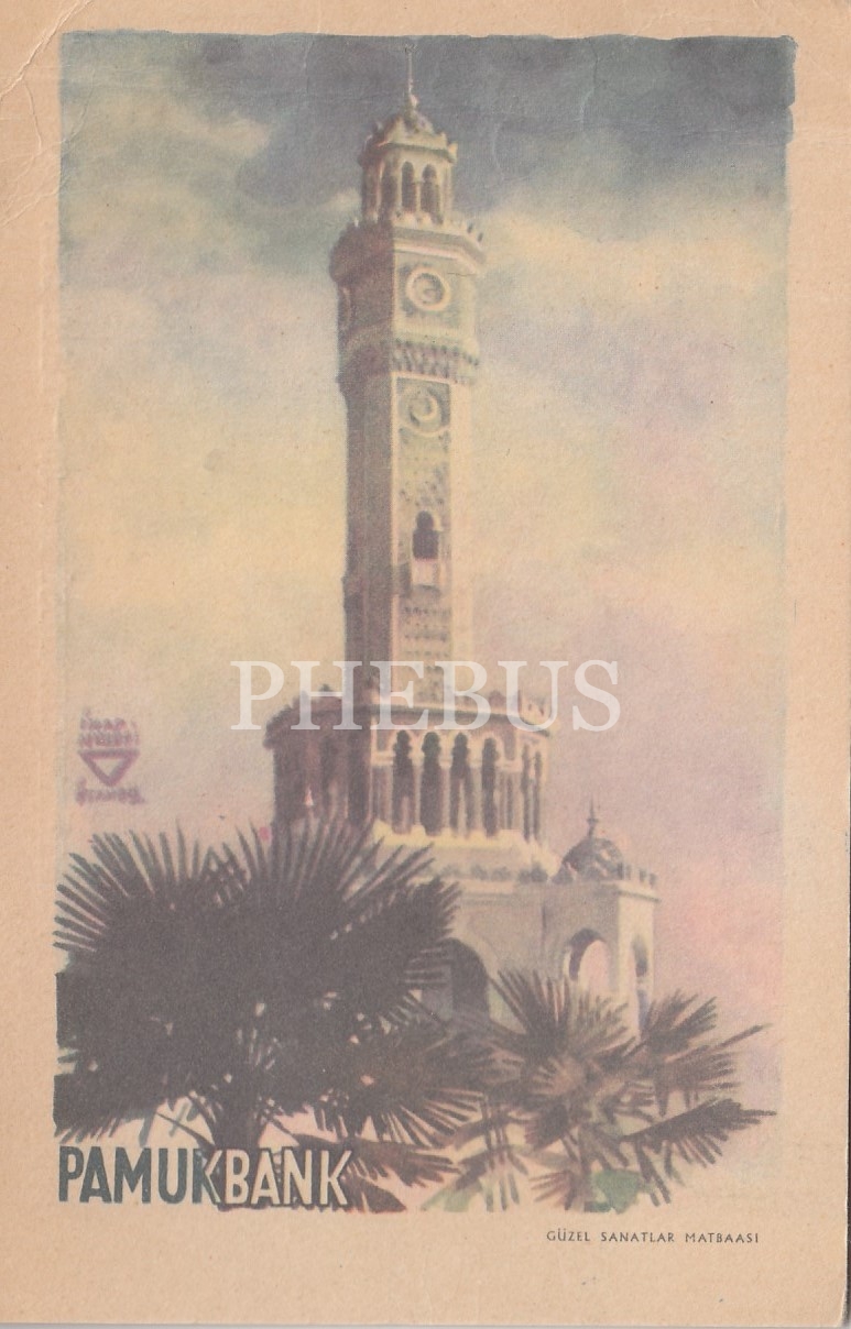 İzmir Saat Kulesi görselli Pamukbank reklam kartı, İhap Hulusi, Güzel Sanatlar Matbaası, 10x15 cm