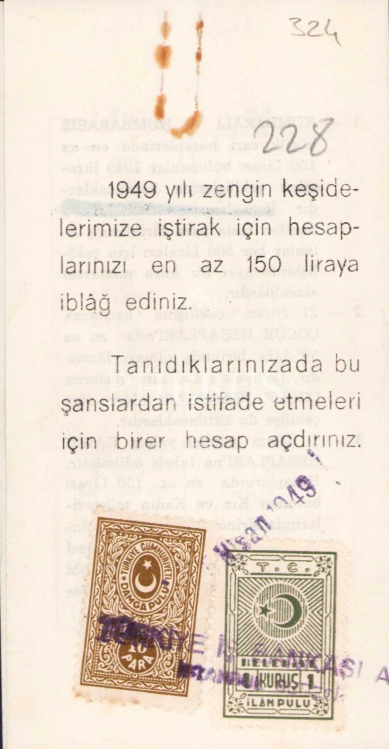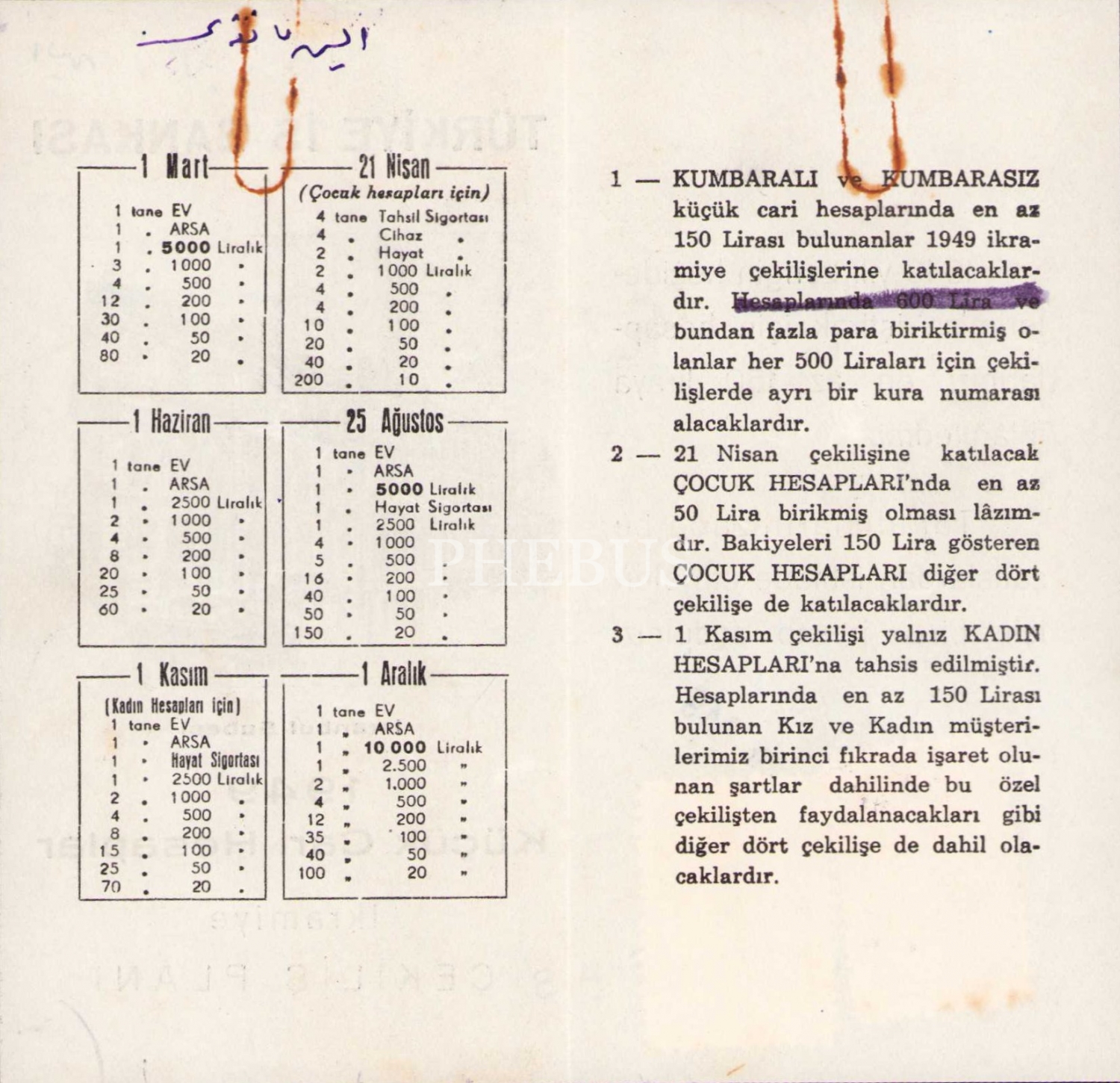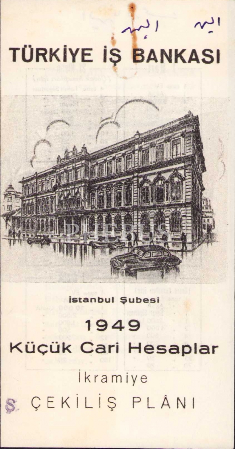Türkiye İş Bankası İstanbul Şubesi 1949 Küçük Cari Hesaplar İkramiye Çekiliş Planı, 7x14 cm