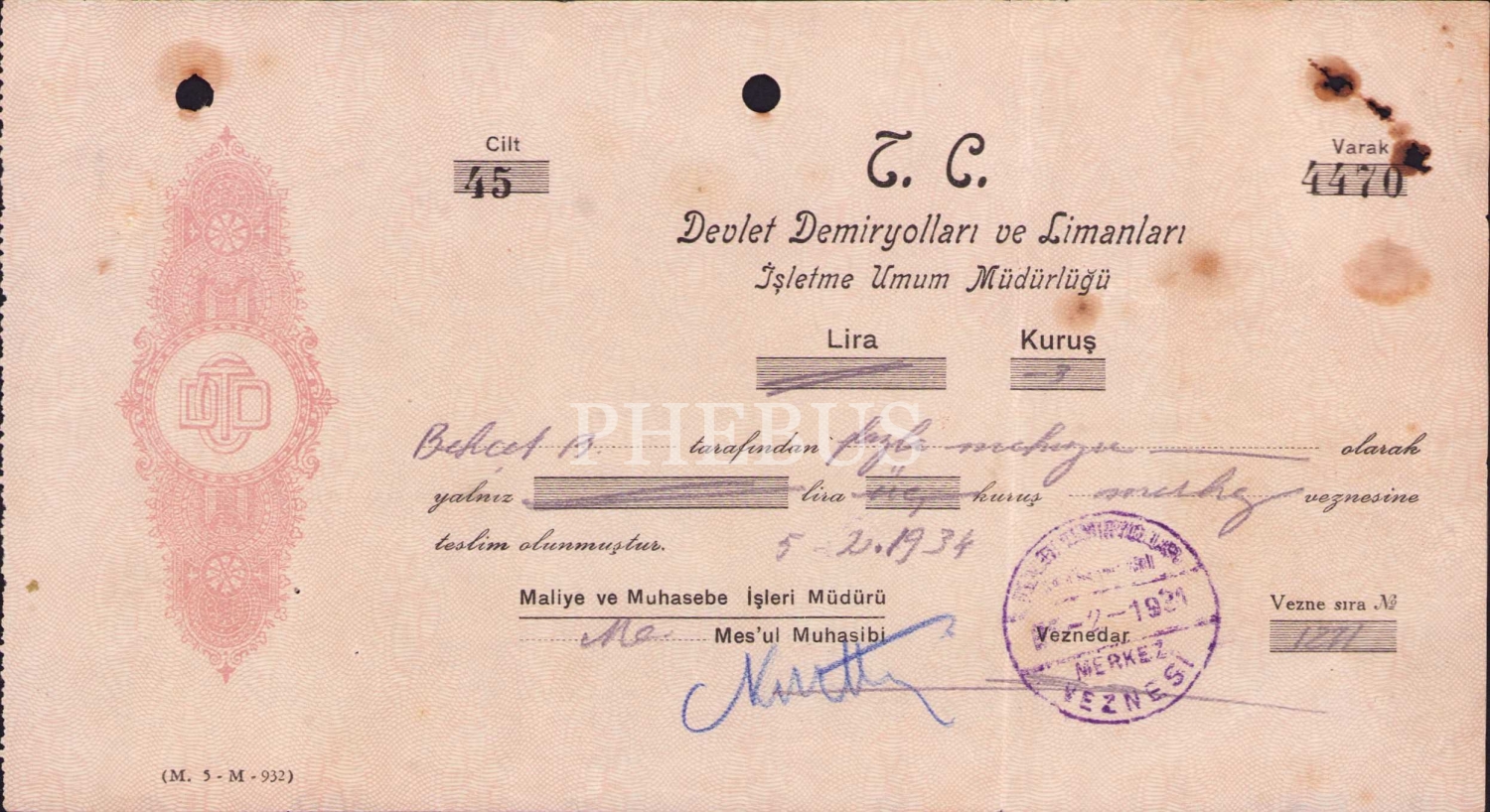 Devlet Demiryolları ve Limanları İşletme Umum Müdürlüğü makbuz, 1934 tarihli, 21x11 cm