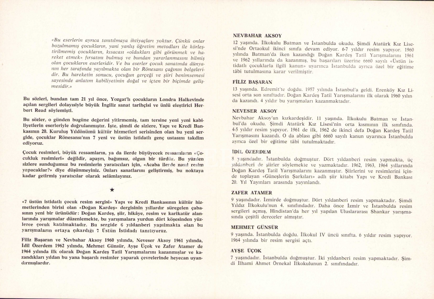 Yapı ve Kredi Bankası 7 Üstün İstidatlı Çocuk Resim Sergisi broşür, 4 sayfa, 14x20 cm