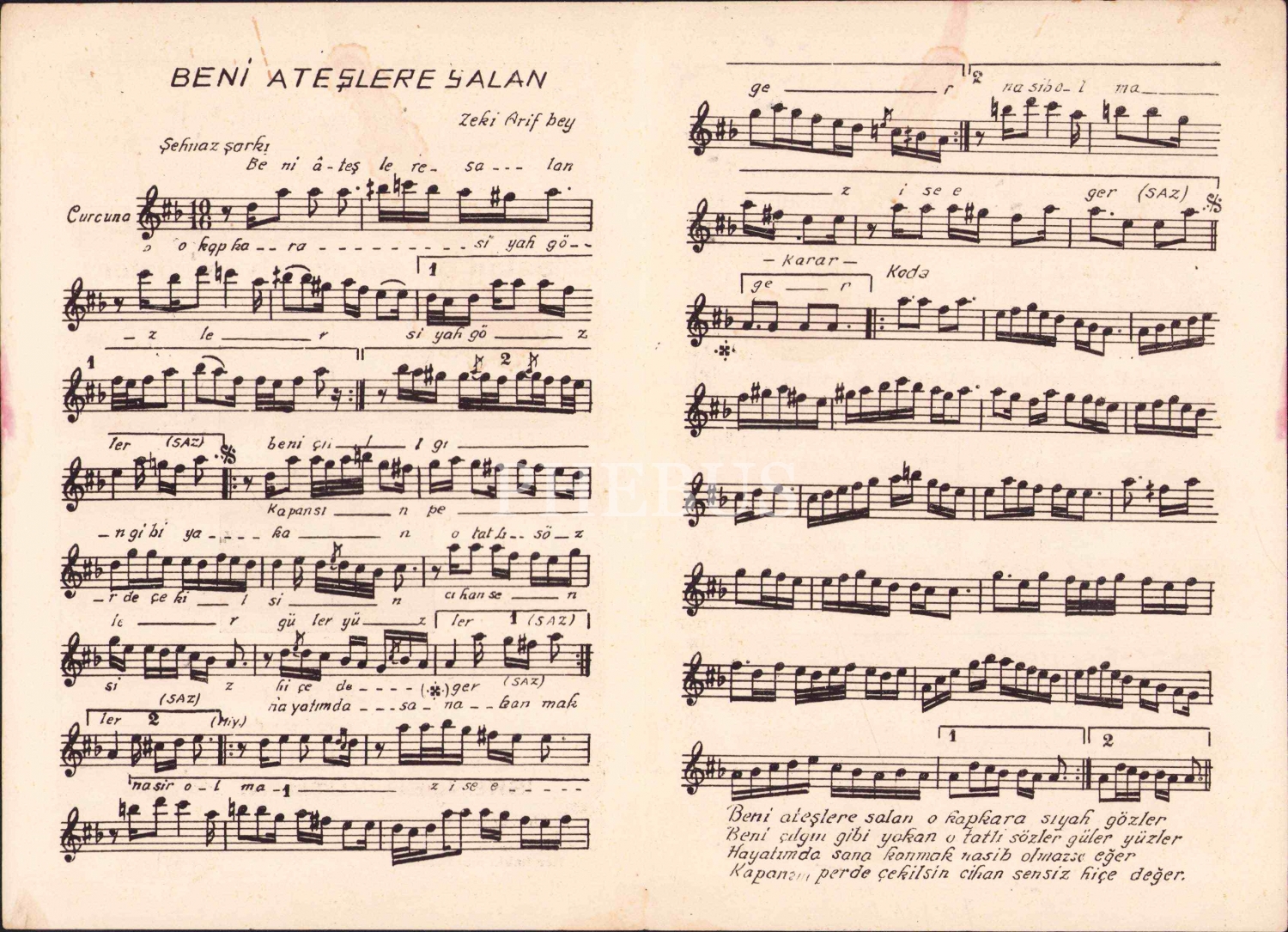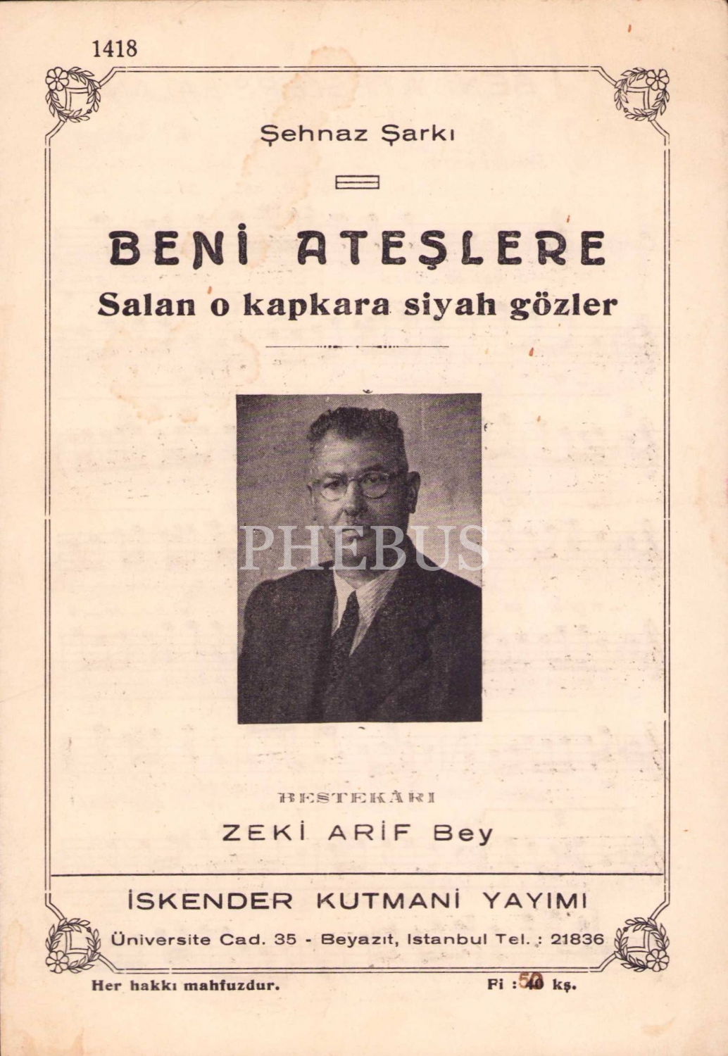 Matbu Nota, Beni ateşlere salan o kapkara gözler, Zeki Arif Ataergin, İskender Kutmani Yayımı, musiki, 2 sayfa, 14x21 cm