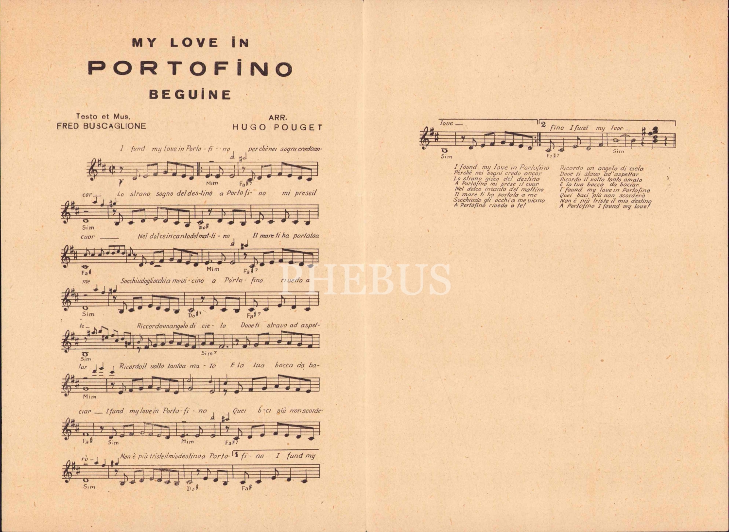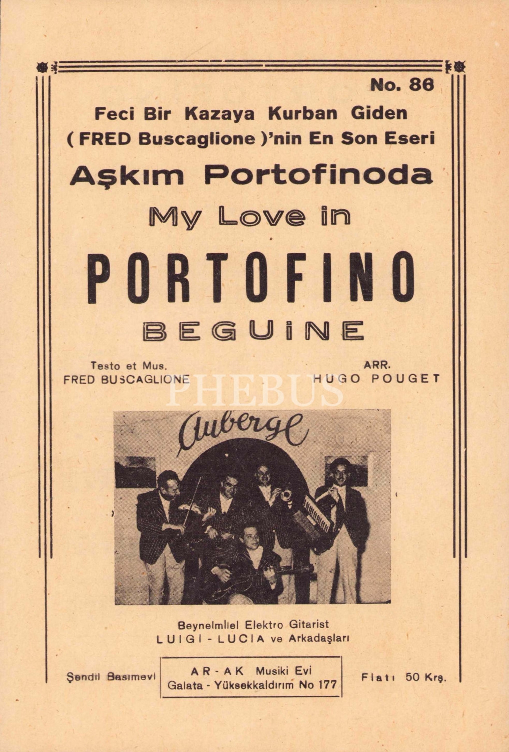 Matbu Nota, Feci Bir Kazaya Kurban Giden Buscaglione'nin En Son Eseri Aşkım Portofinoda, Arak Musiki Evi, 2 sayfa, 17x25 cm
