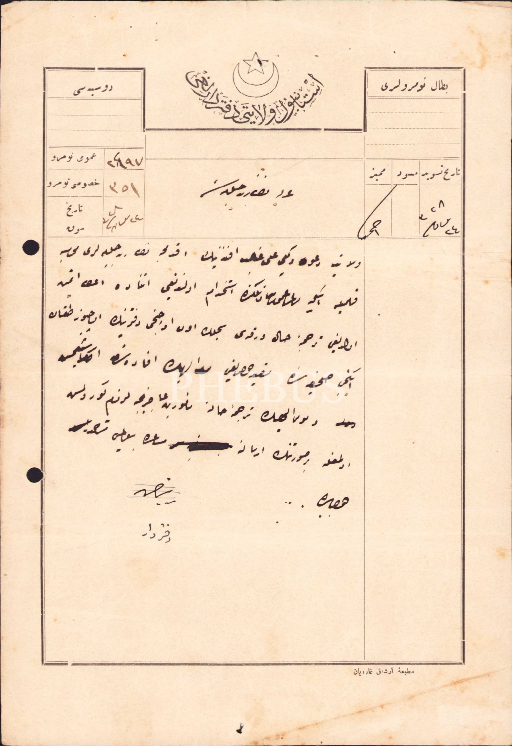 İstanbul Vilayeti Defterdarlığı antetli Adliye Nezareti'ne yazılmış Osmanlıca belge, 18x26 cm