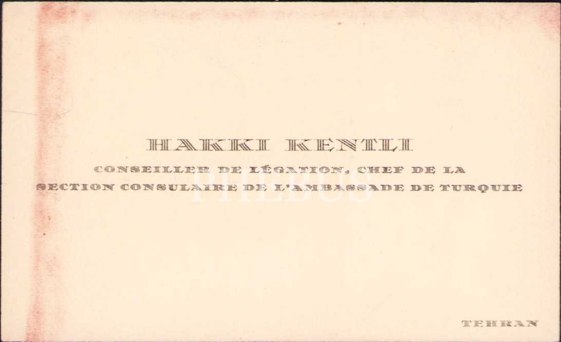 Tahran Türk Konsolosluğu'nda görevli Hakkı Kentli'ye ait kartvizit, 9x6 cm