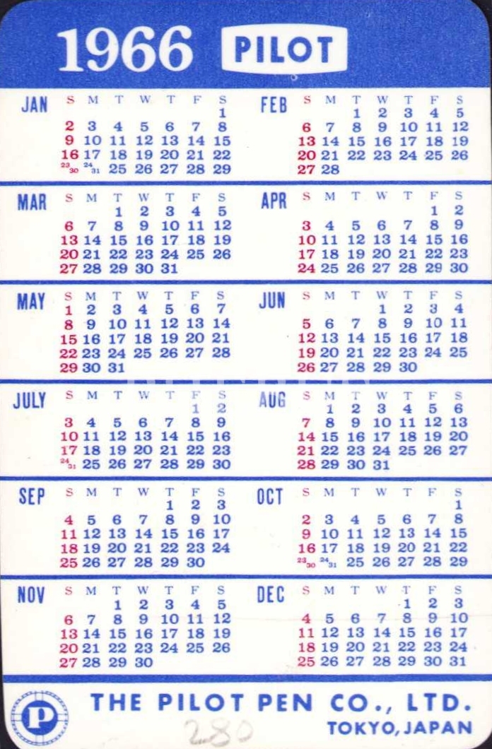 Pilot Capless kalemleri 1966 takvim, 6x9 cm