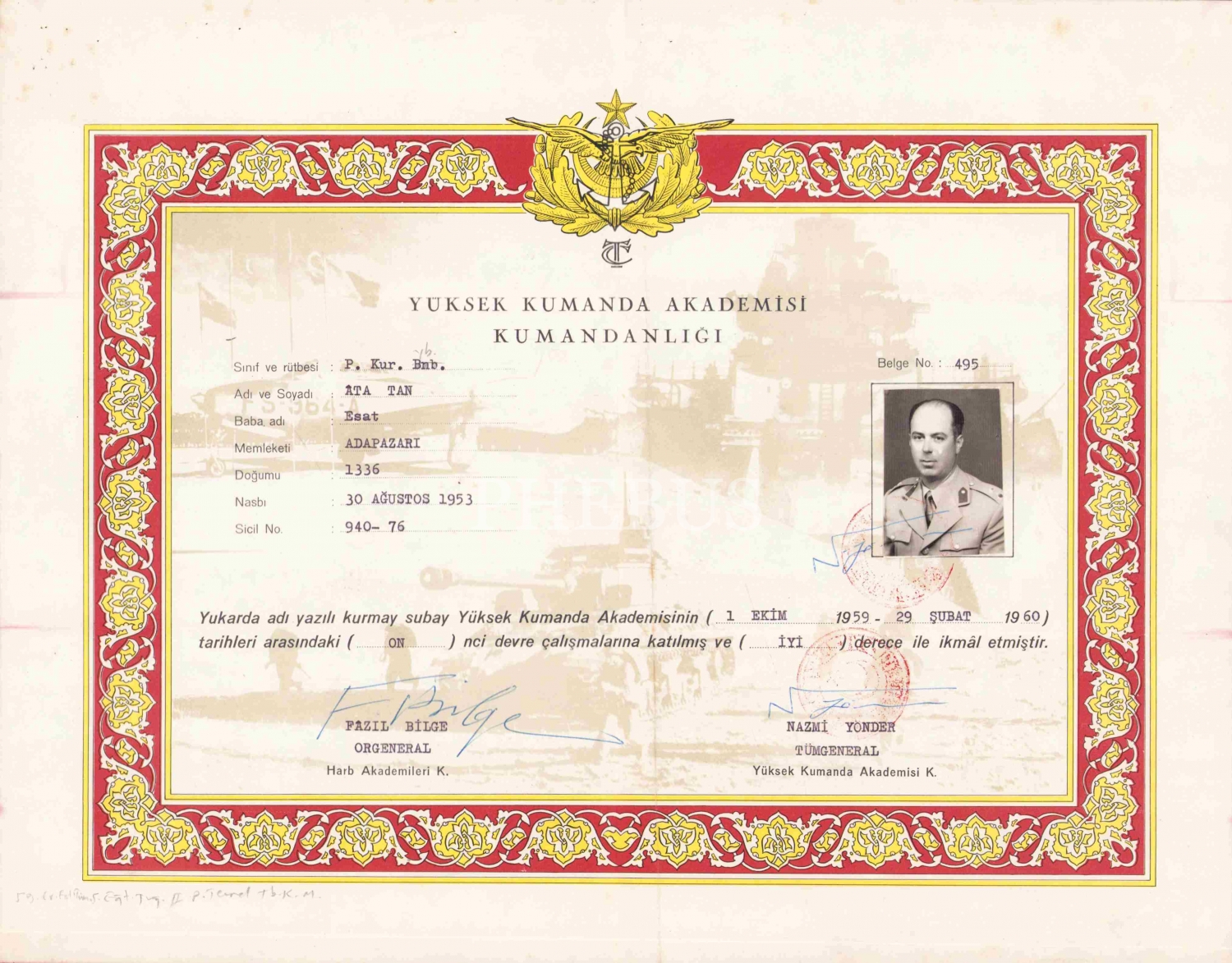Yüksek Kumanda Akademisi Kumandanlığı diploması, 1953 tarihli, 38x30 cm