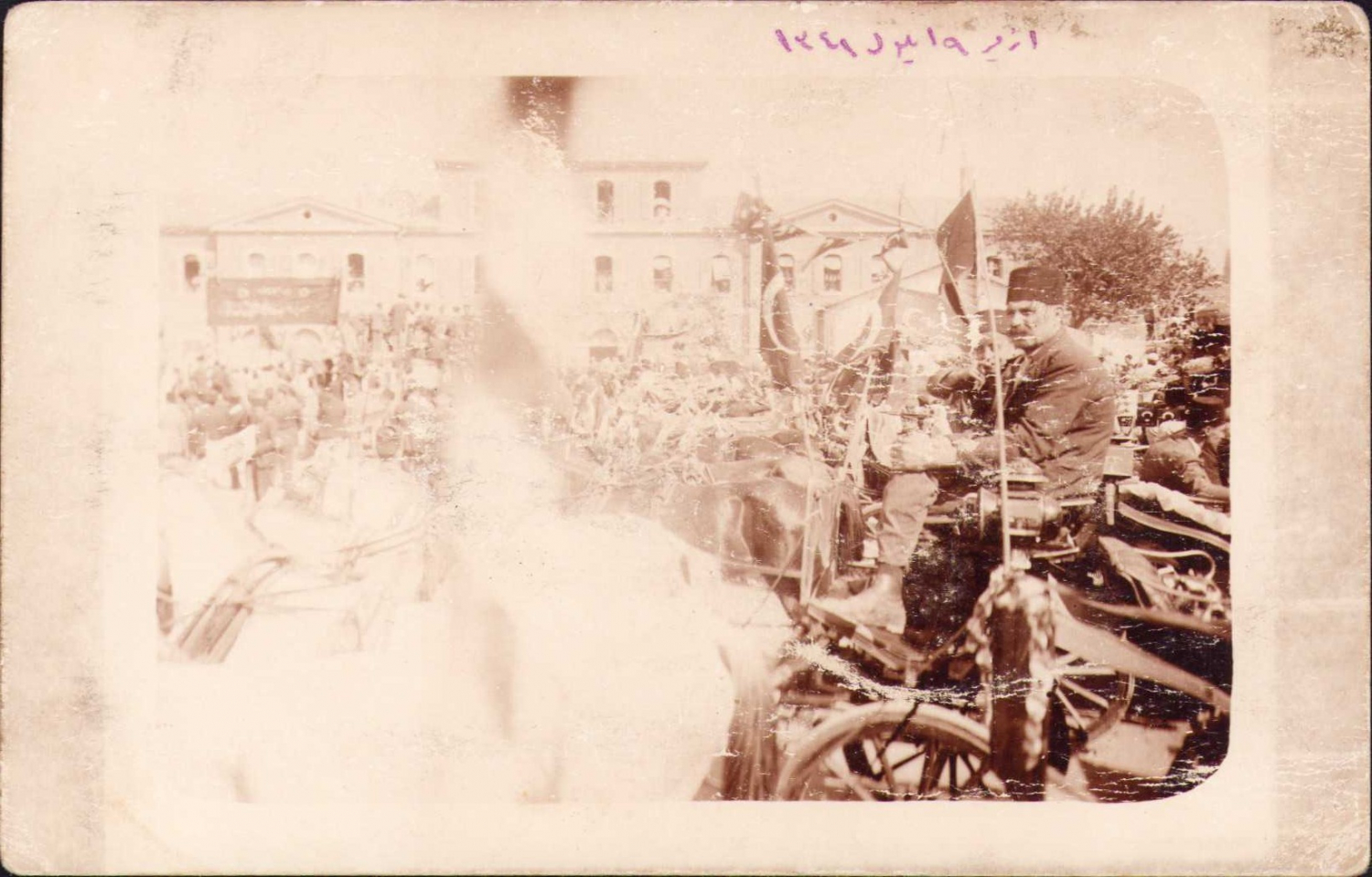 İzmir'in Kurtuluşu kutlamaları, İzmir 9 Eylül 1341, Osmanlıca yazılı, bayrak detaylı