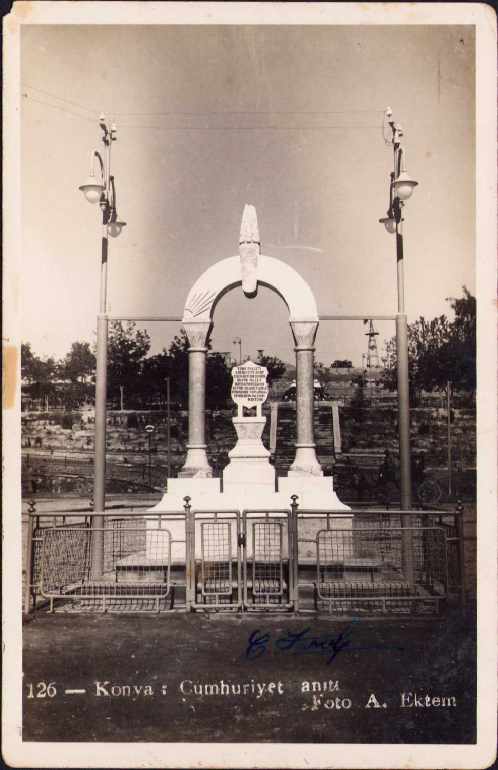 Konya Cumhuriyet Anıtı genel görünüm, 6 ok ve Atatürk Foto A. Ekrem, arka yüzü yazılı