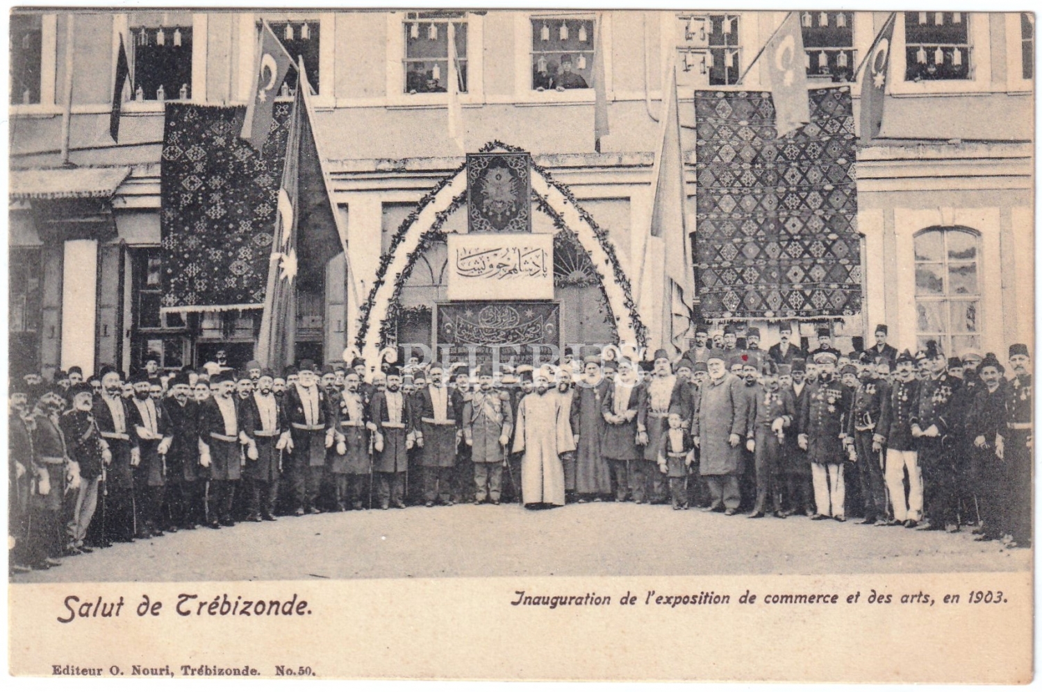 Osmanlıca, Rumca, Ermenice Trabzon Vilayeti Mamulat ve Mahsulat Sergisi Panosu Önünde Vali ve Şehrin Önde Gelenleri Edt. O. Nouri
