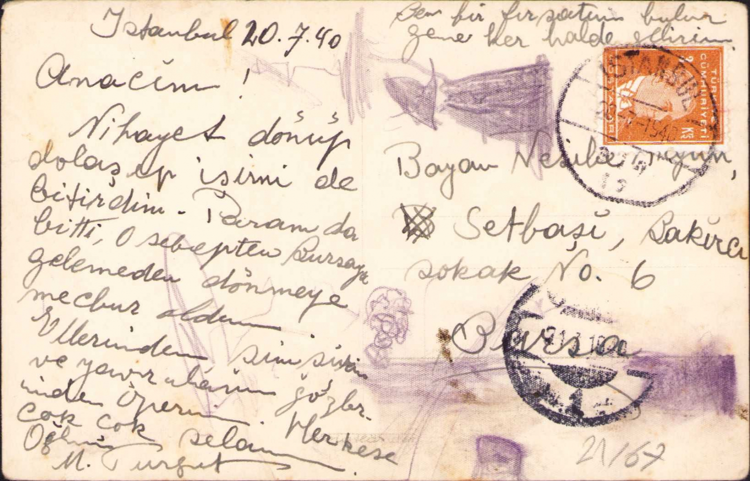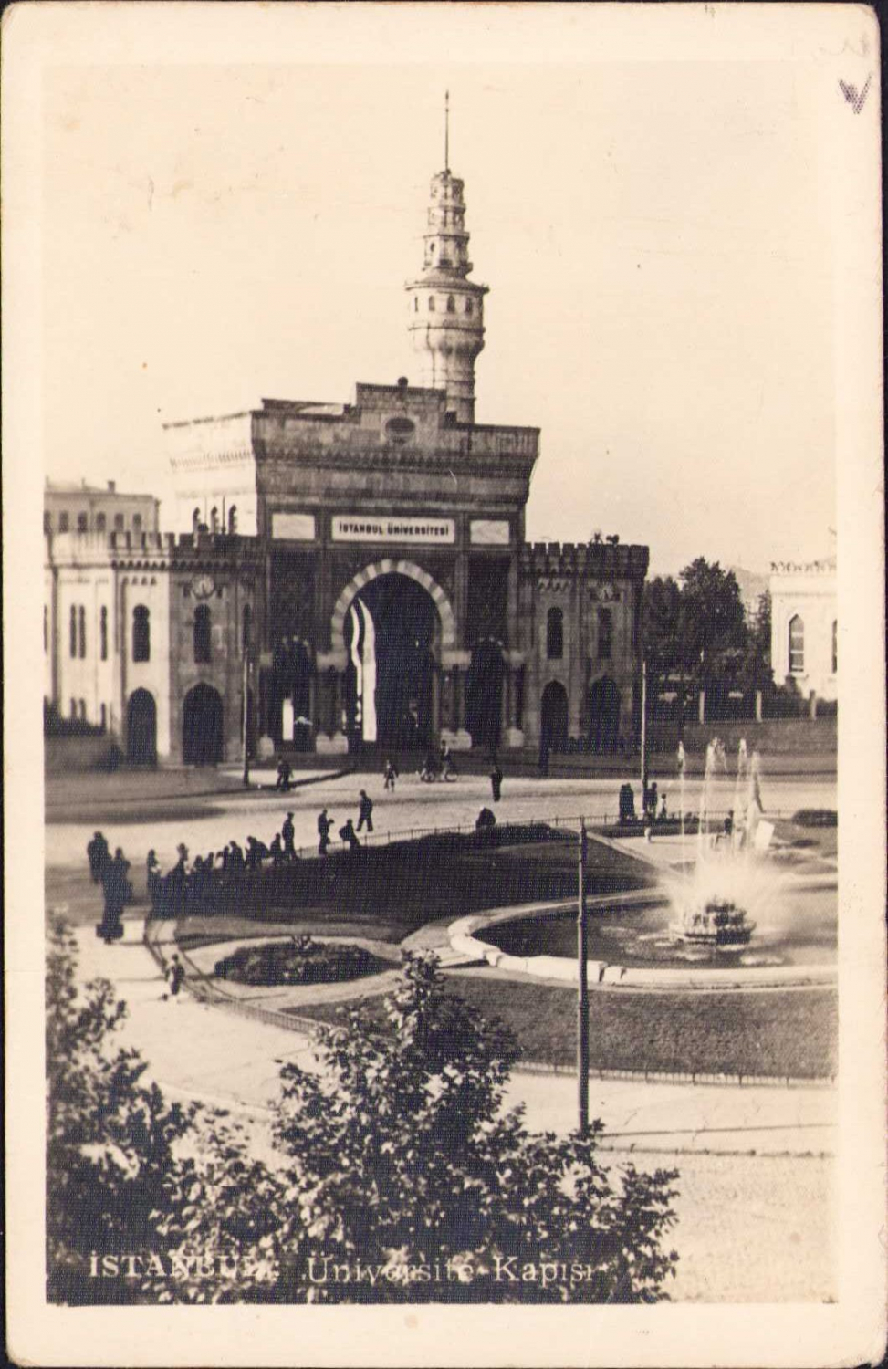 İstanbul Üniversitesi kapısı, 1940 tarihli, pullu, damgalı, postadan geçmiş, Bursa adresli, arkası yazılı, üst kısmında kırık var