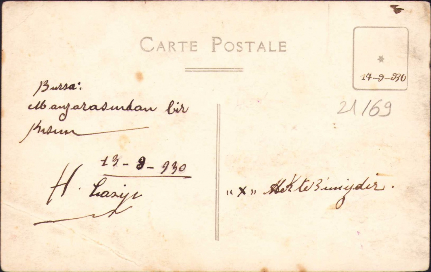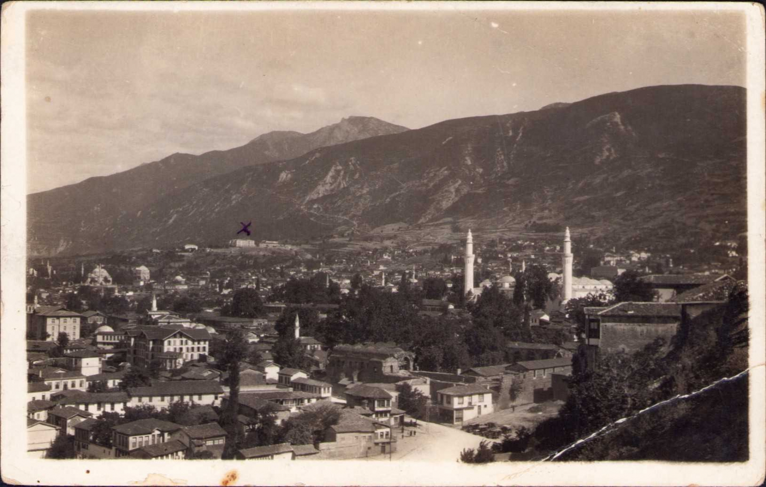 Bursa'da bir mektep görüntüsü, genel şehir manzarası, 1930 tarihli, arkası ithaf yazılı, sağ köşe kırık