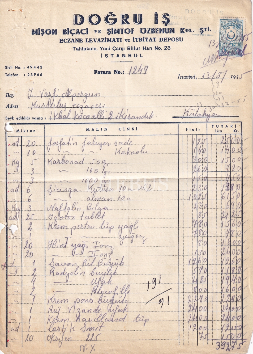 Yahudi Mişon Biçacı Itriyat Ticarethanesi Faturası