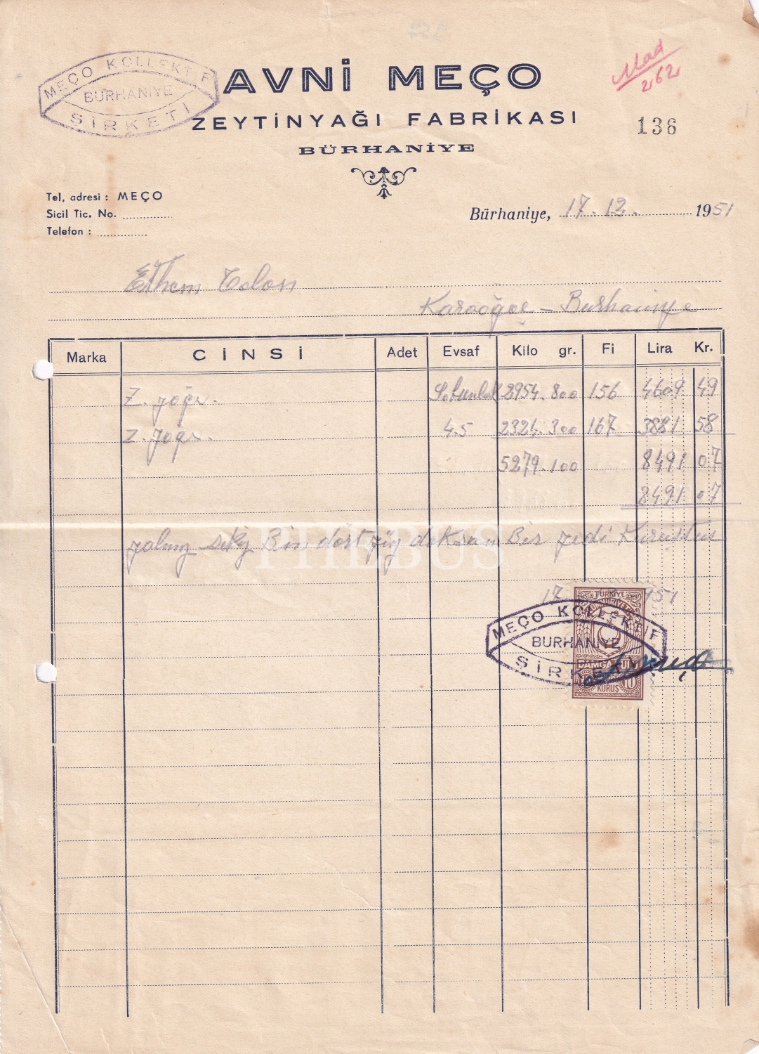 Balıkesir Burhaniye'de Avni Meço Zeytinyağı Fabrikası Faturası