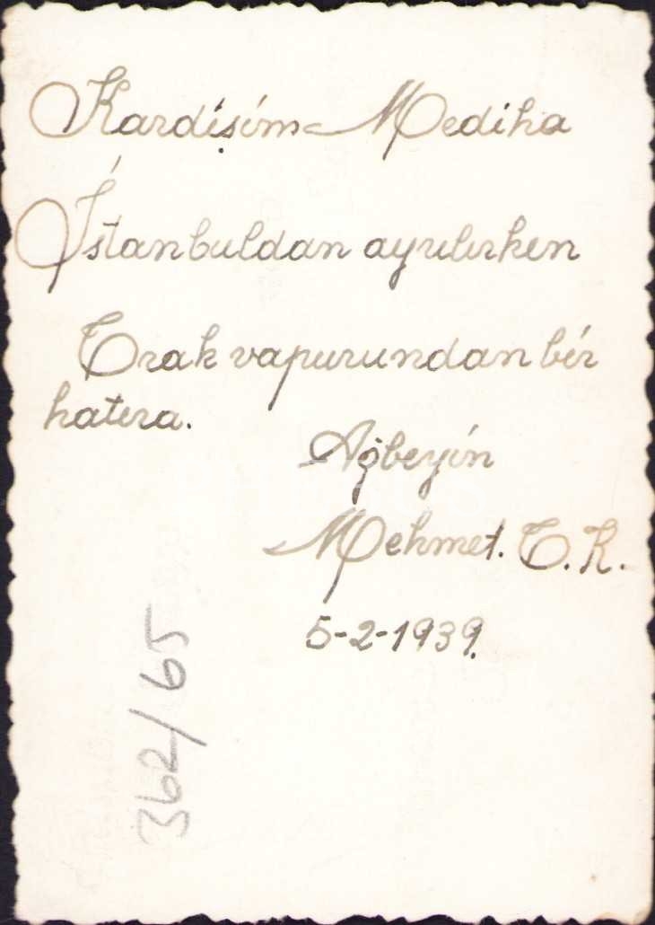 Vapur seyahati hatırası, arkası kardeşine ithaflı, 1939 tarihli, 8x6 cm