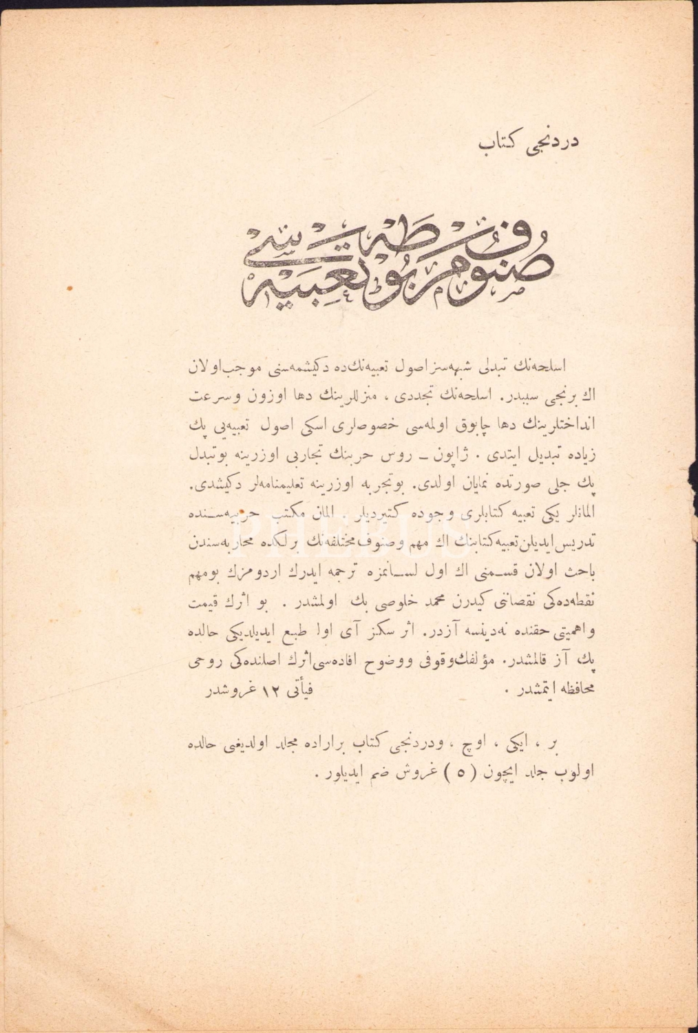 "Muharebe Dersleri", "Niçin Mağlub Olduk", "Piyadenin Muharebede Harekatı", "Alman Sahra Topçu Talimatnamesi" isimli kitaplar hakkında tanıtım yazıları, Osmanlıca, pullu, 8 sayfa, 16x24 cm