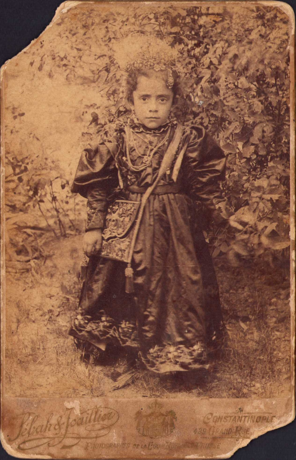 Osmanlı dönemi çocuk portresi, Kuran cüzü çantalı, açık alanda çekilmiş kabin fotoğrafı, Foto Sebah & Joaillier, Constantinople, iki kenarı kesik, haliyle, 10,5x16,5cm