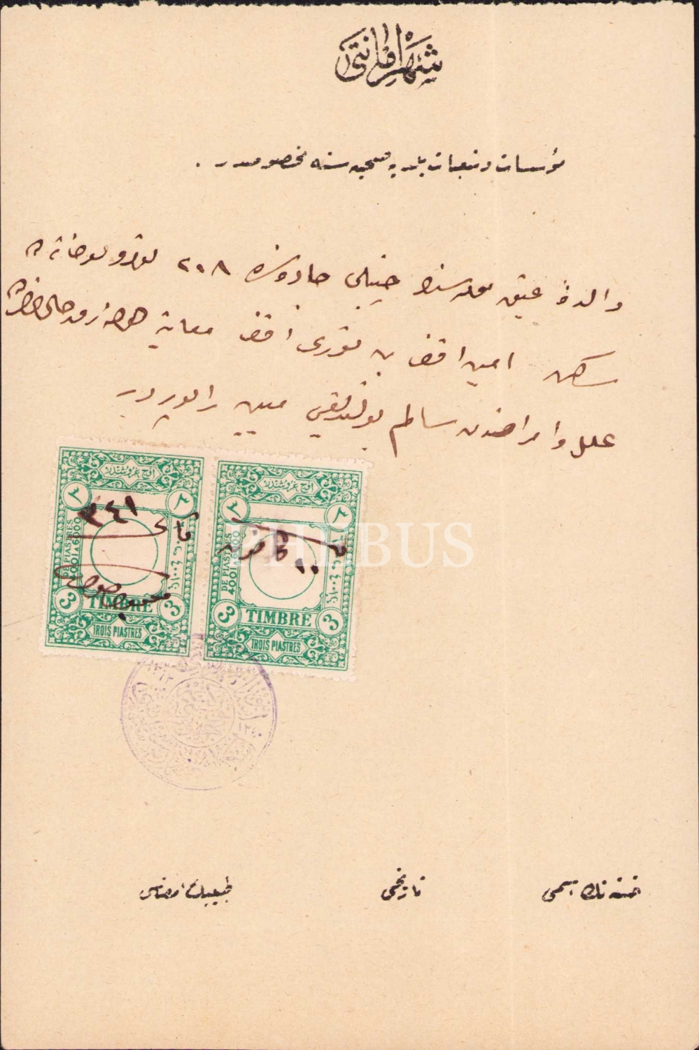 Şehremaneti antetli Valide-i Atik mahallesinde sakin Nuri Efendi ile alakalı belge, damgalı ve pullu, 12x18 cm