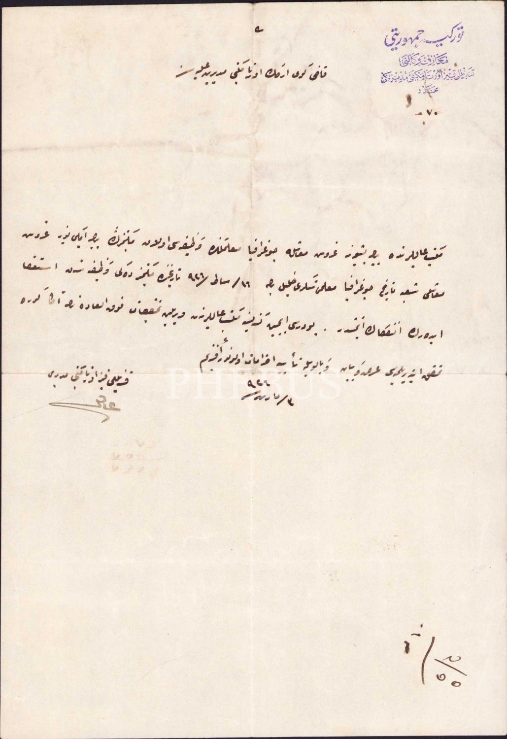 Kandilli Kız Orta Mektebi Müdürü tarafından yazılmış Osmanlıca belge, 17x25 cm