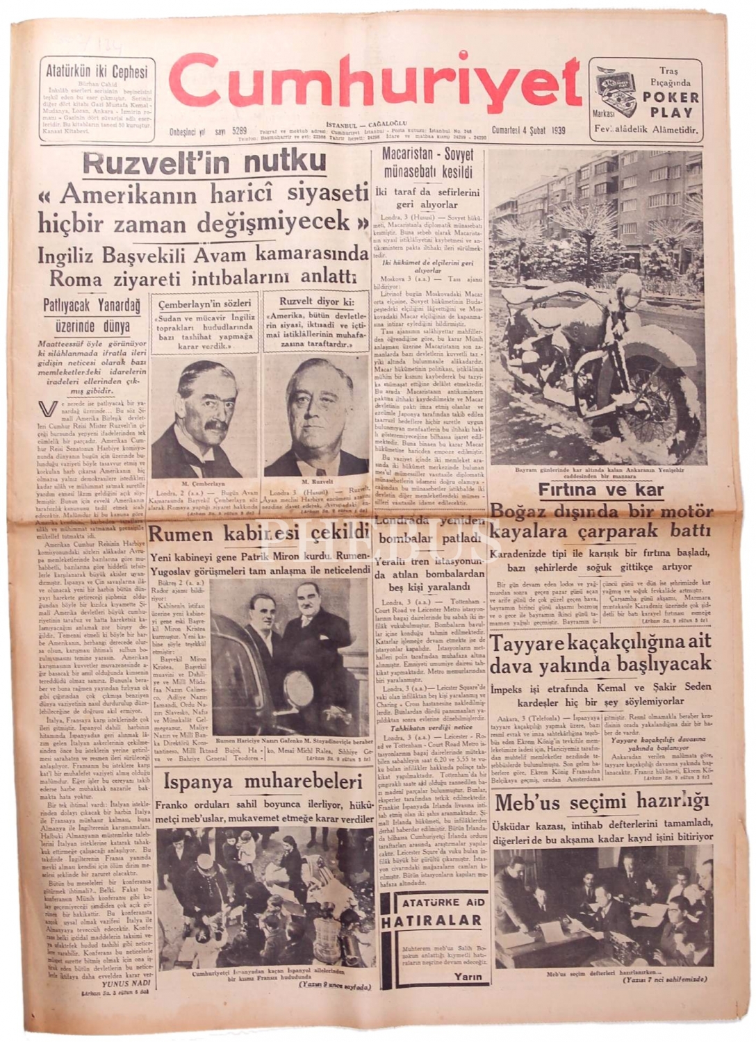 Cumhuriyet gazetesi, 4 Şubat 1939 tarihli, "Ruzvelt'in Nutku", 12 sayfa, 44x66 cm