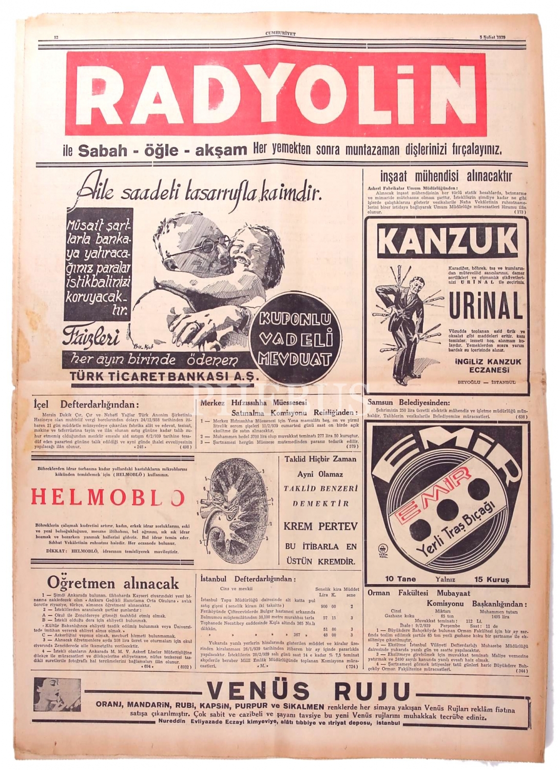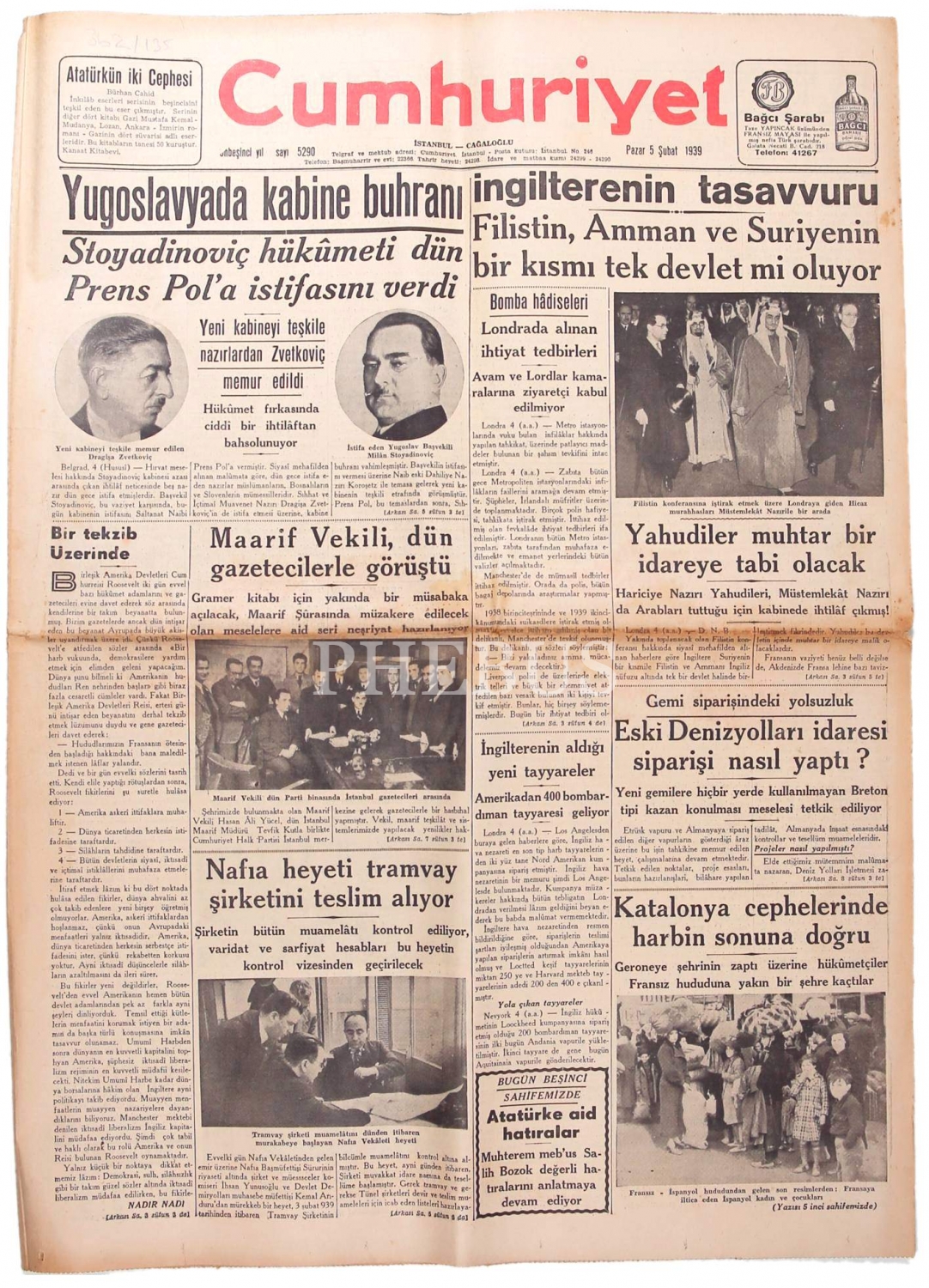 Cumhuriyet gazetesi, 5 Şubat 1939 tarihli, "Yugoslavya'da Kabine Buhranı", 12 sayfa, 44x66 cm