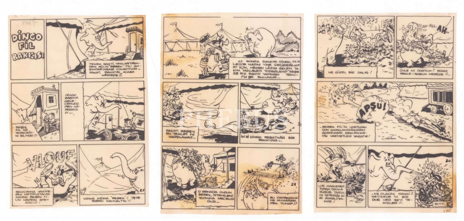 Aydıner orijinal çalışması, 3 adet Dingo Fil Bakıcısı eskizi, 10x13 cm