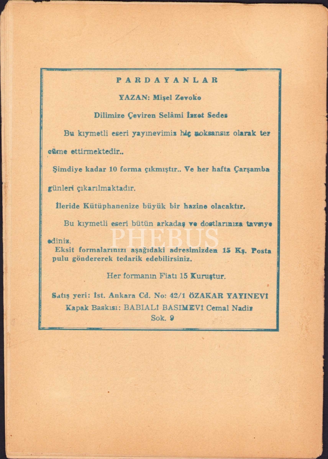 Pardayanlar - Sayı: 12, Mişel Zevako, çev. Selami İzzet Sedes, kapak çizim T. Korkmaz, sırtı haliyle, 15 sayfa, 12x19 cm