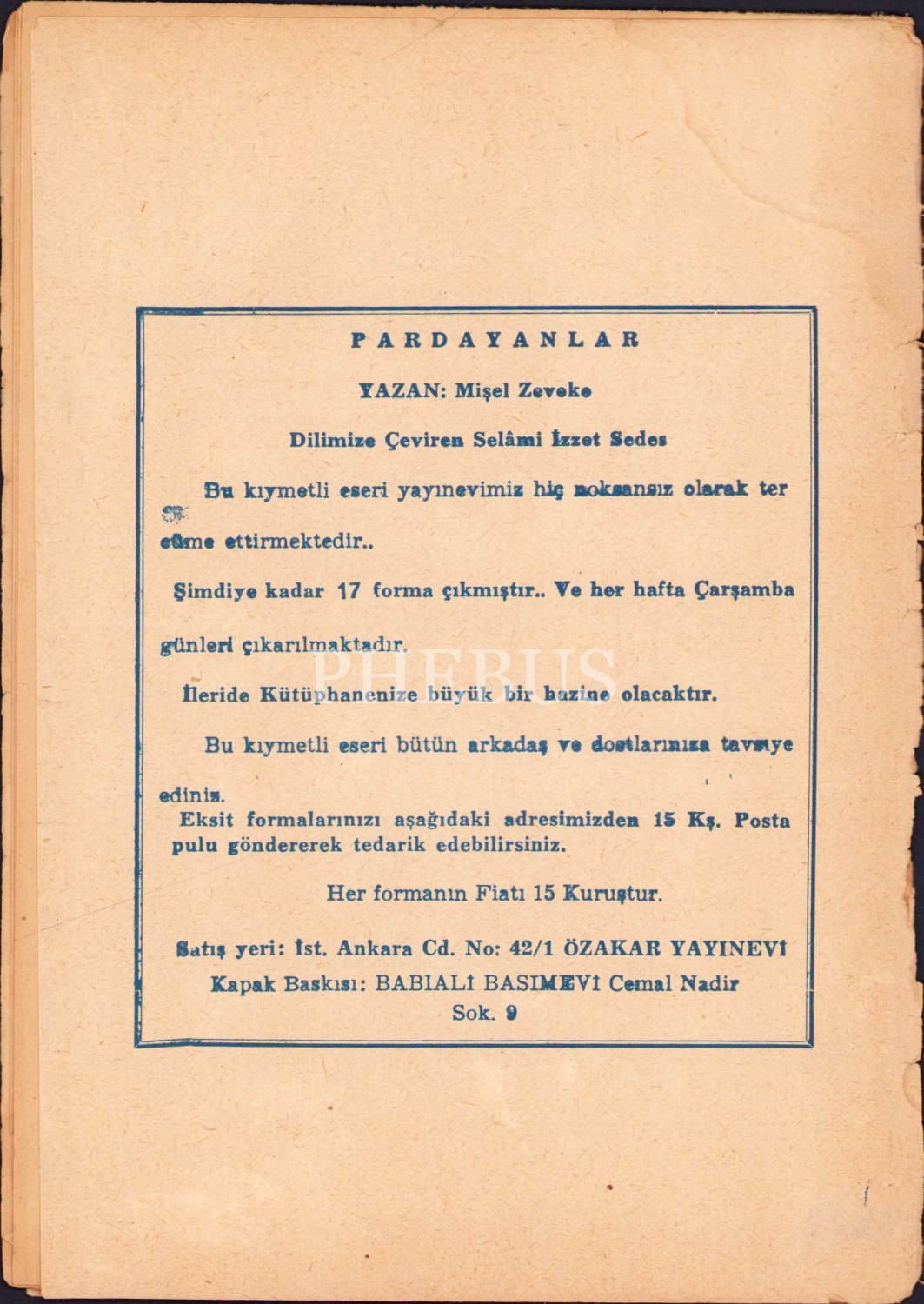 Pardayanlar - Sayı: 17, Mişel Zevako, çev. Selami İzzet Sedes, kapak çizim T. Korkmaz, sırtı haliyle, 15 sayfa, 12x19 cm