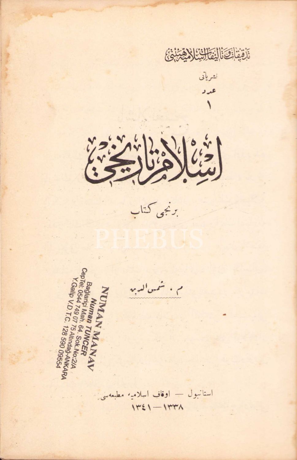 Osmanlıca İslâm Tarihi, M. Şemseddin [Günaltay],1341 Evkâf-ı İslâmiye Matbaası, Tedkikat ve Telifât-i İslâmiye Heyeti Neşriyatı, 416 sayfa, ÖZEGE; 9377, 21x14 cm
