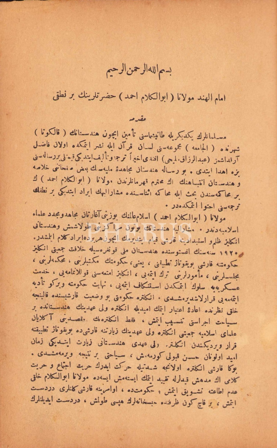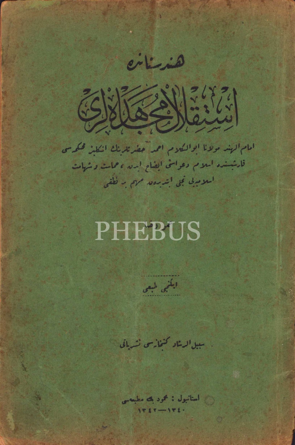 Osmanlıca Hindistan'da İstiklâl Mücahedeleri, Ebu'l-Kelâm Ahmed, Çeviren Ömer Rıza [Doğrul] İstanbul 1340 Amedî Matbaası, 38 sayfa, ÖZEGE; 7657, 21x14 cm