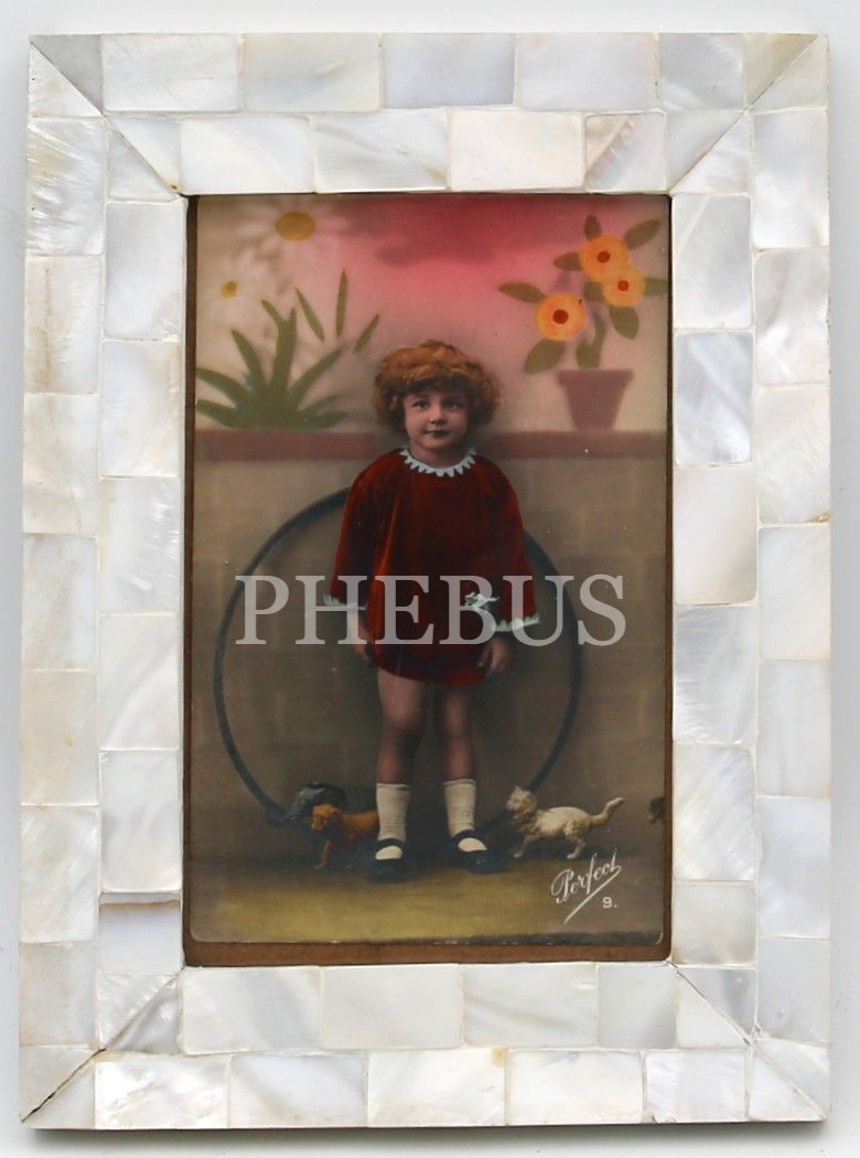 Sedefli çerçevesinde, Fransız baskı, arkası 1932 tarihli bayram tebrikli, renklendirilmiş oyuncaklı kız çocuğu kartpostal,14x20x1 cm