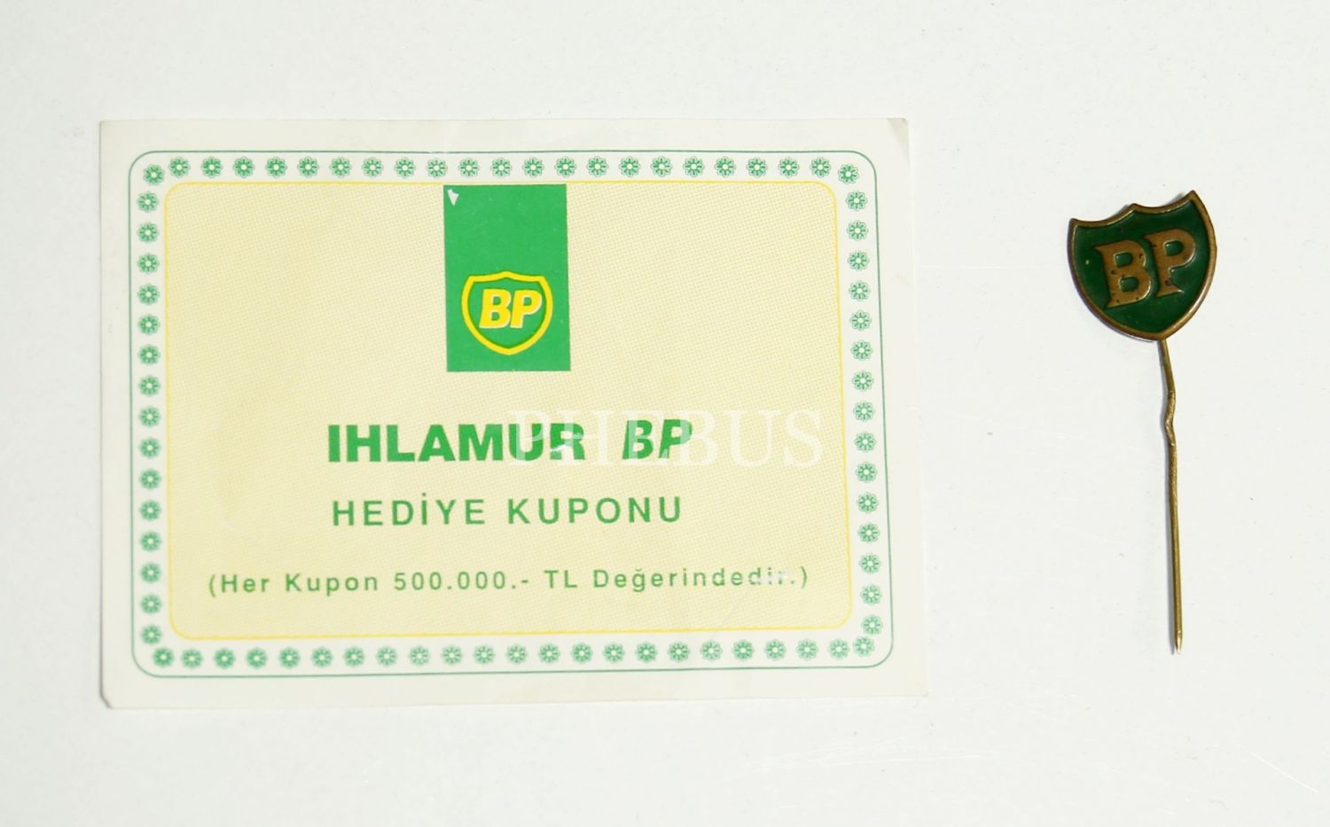 Ihlamur BP Benzin İstasyonu hediye kuponu ve BP rozeti, 9x6 ve 1.5x5 cm