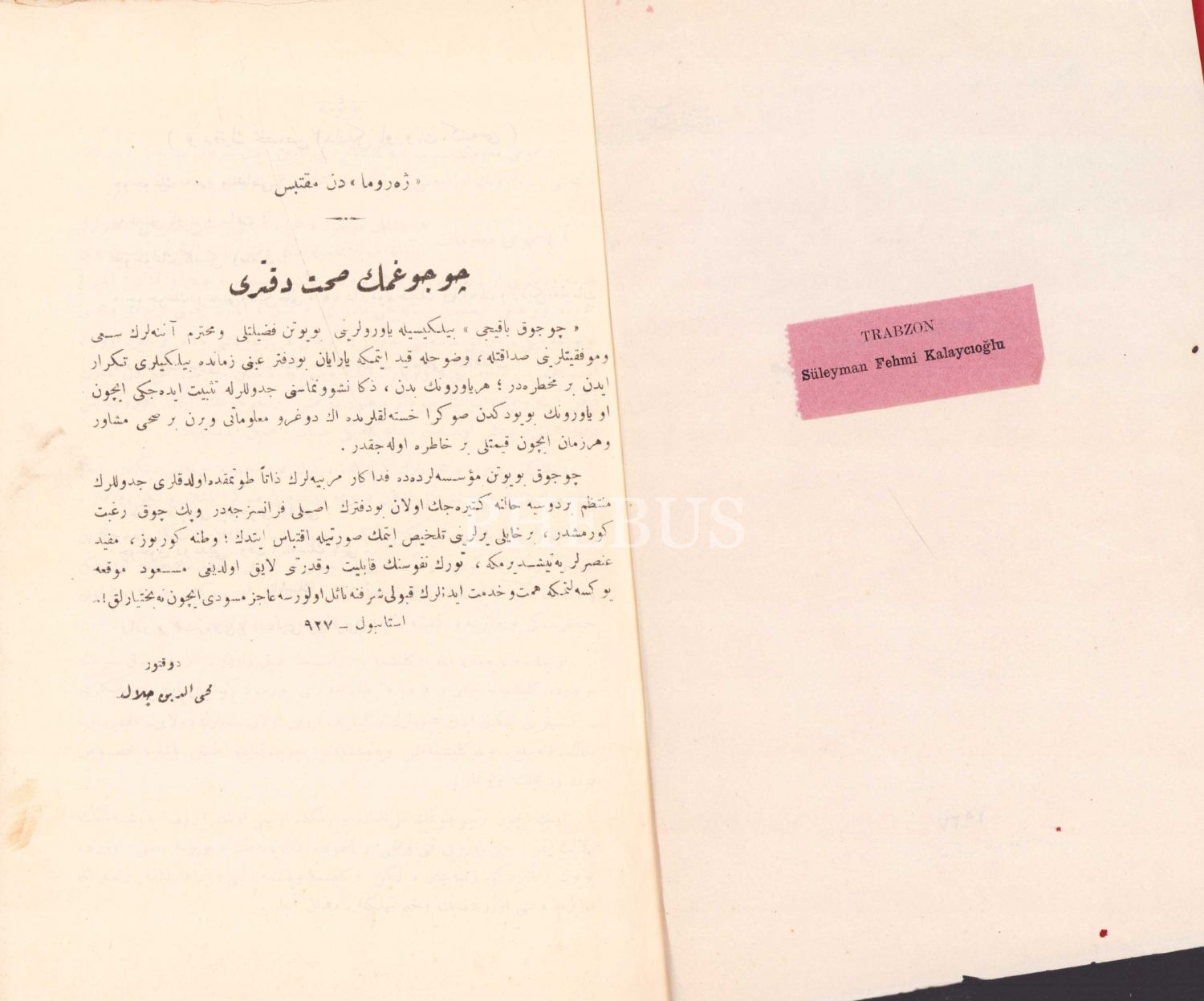 Osmanlıca Çocuğun Sıhhat Defteri, Jerome, Çeviren Muhiddin Celal [Duru], 1927 Hâkimiyet-i Milliye Matbaası, 71+1 sayfa, ÖZEGE; 24271 25x17 cm