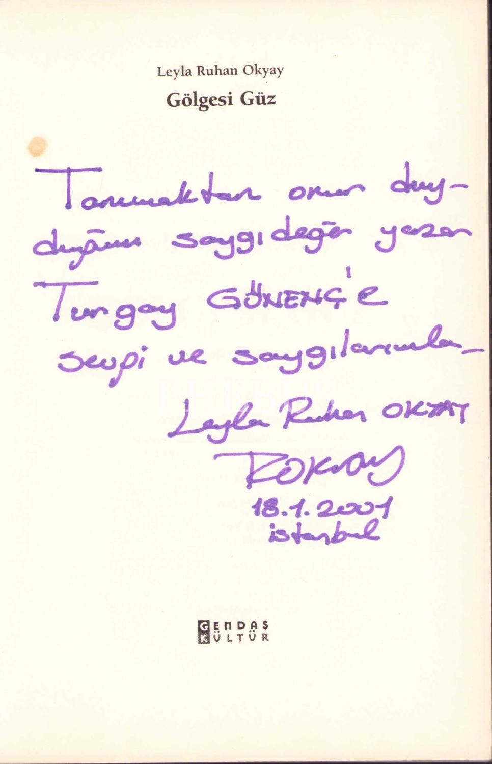 İthaf "Tanımaktan onur duyduğum saygıdeğer yazar Turgay Gönenç'e sevgi ve saygılarımla. 18.01.2001 İstanbul" şeklindedir