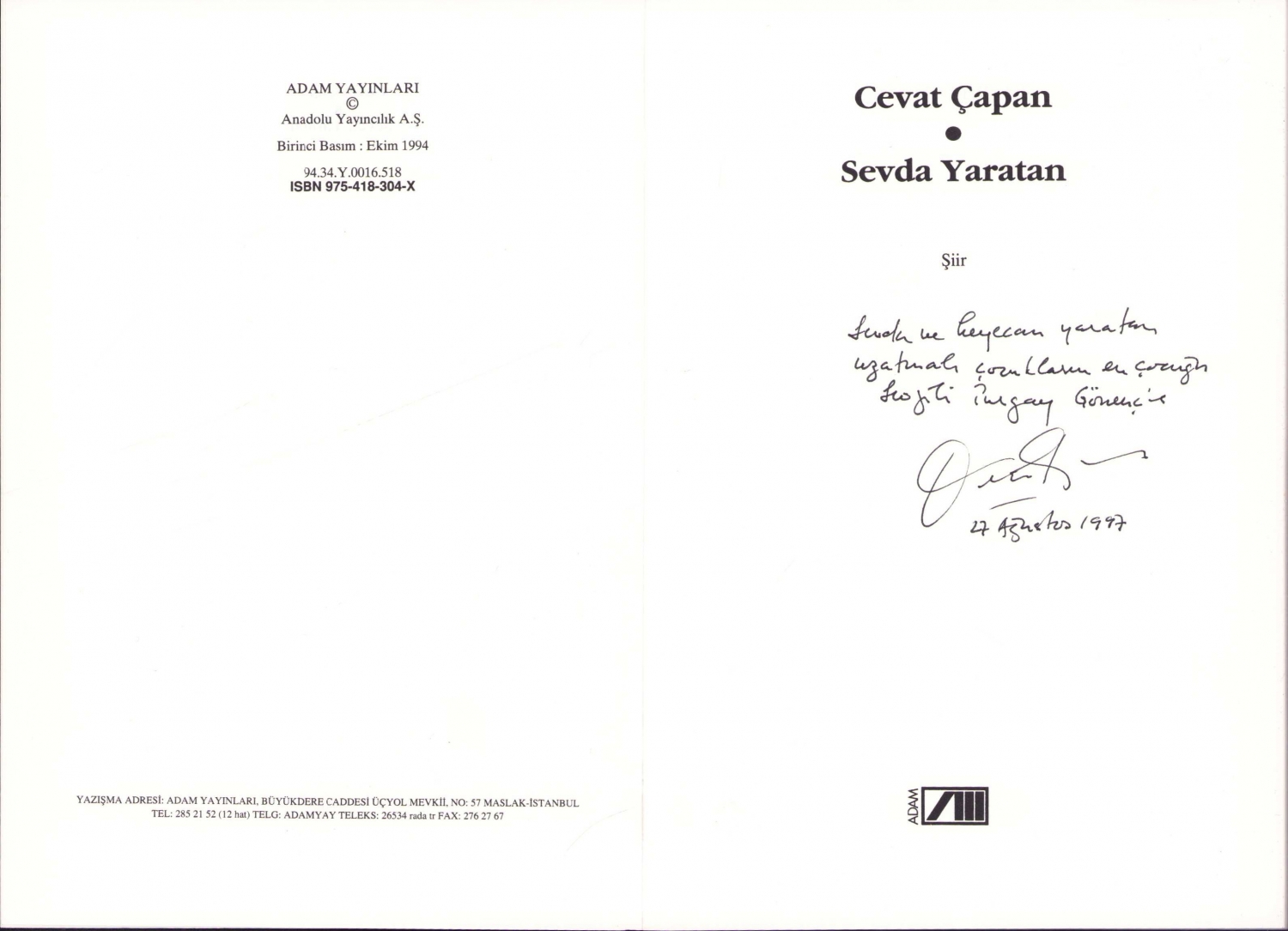 Sevda Yaratan -Şiir-, Cevat Çapan'dan imzalı ve ithaflı, ilk baskı 1994, 61 sayfa