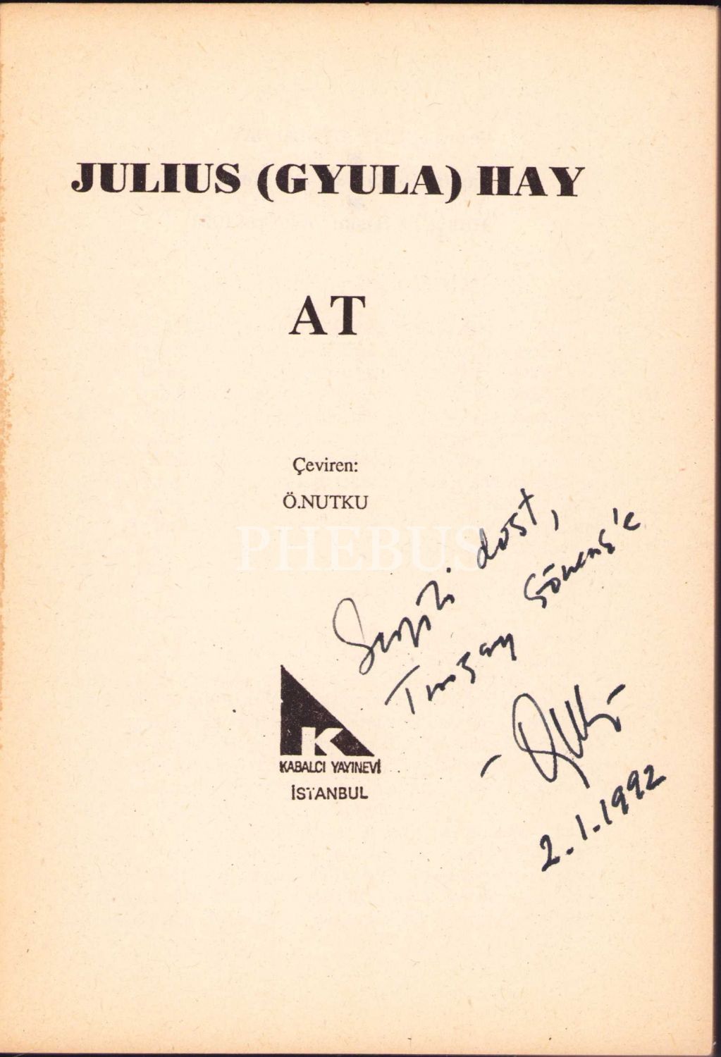 At, Gyula Hay -Oyun-, Çevirmeni Özdemir Nutku'dan imzalı ve ithaflı, 1991, 109 sayfa