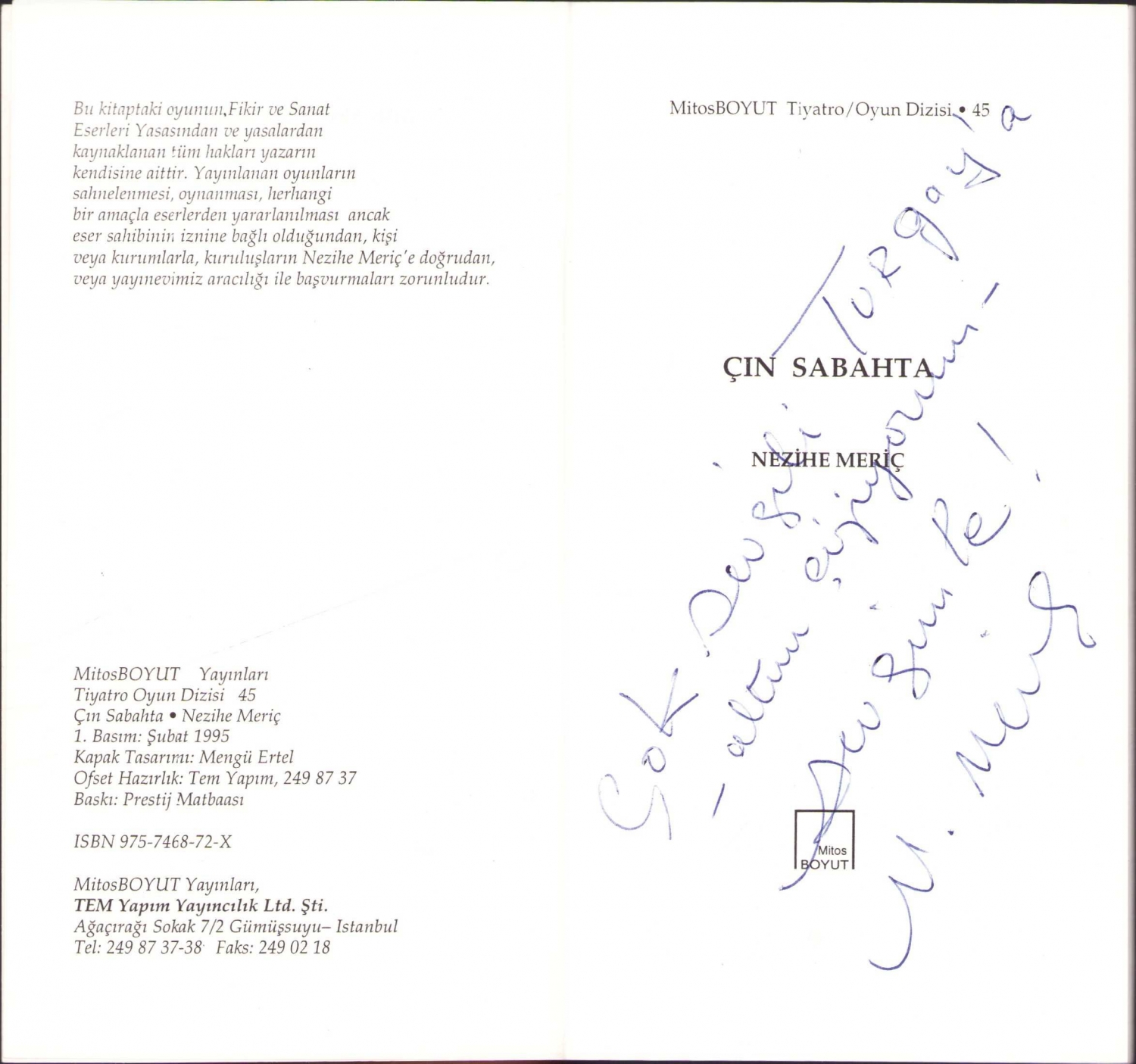 Çın Sabahta -Oyun-, Nezihe Meriç'ten imzalı ve ithaflı, 1995, 59 sayfa
