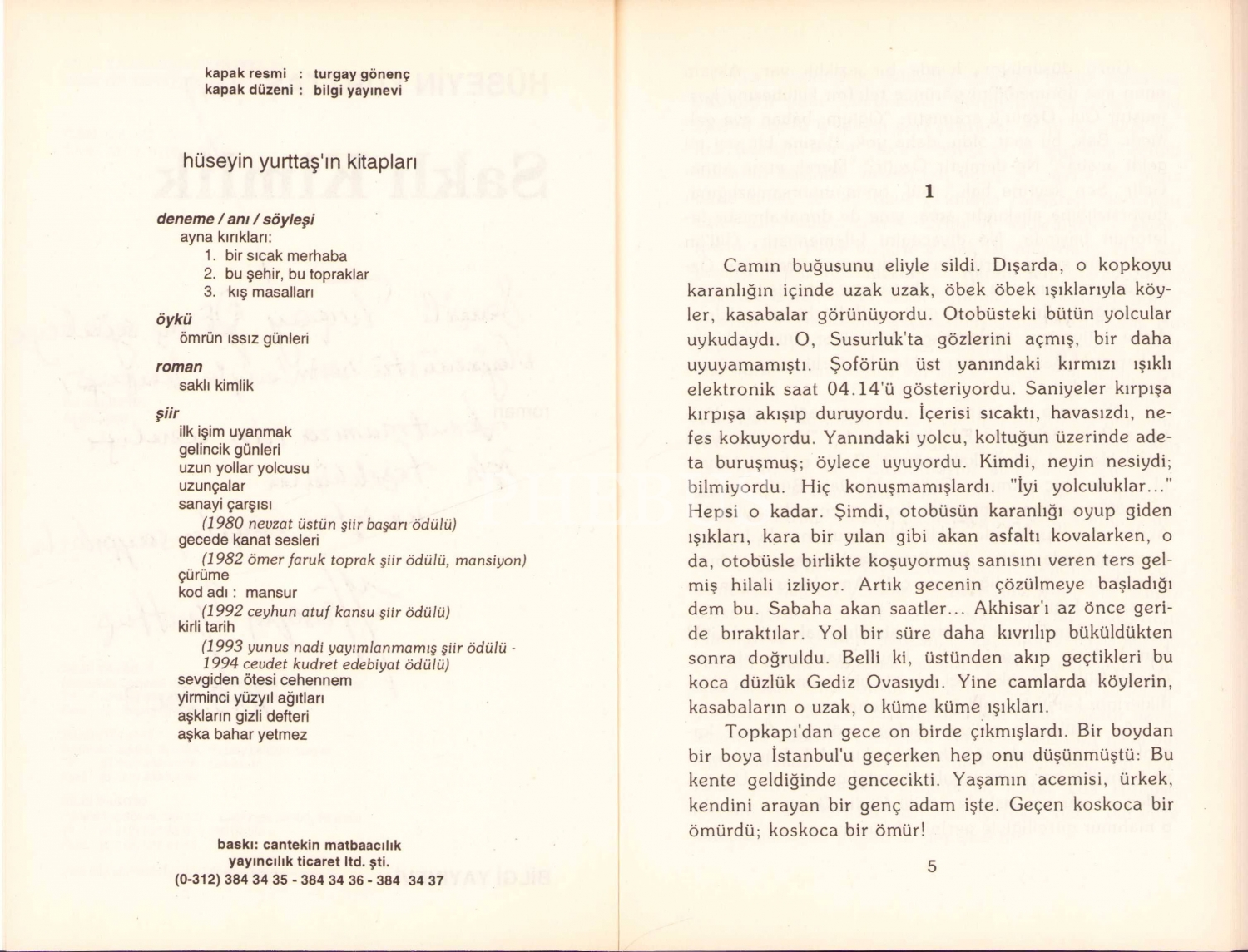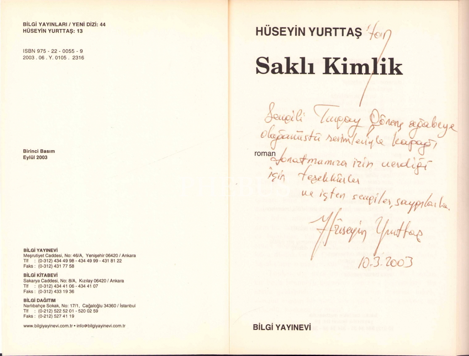 Saklı Kimlik -Roman-, Hüseyin Yurttaş'tan imzalı ve ithaflı, 2003, 216 sayfa