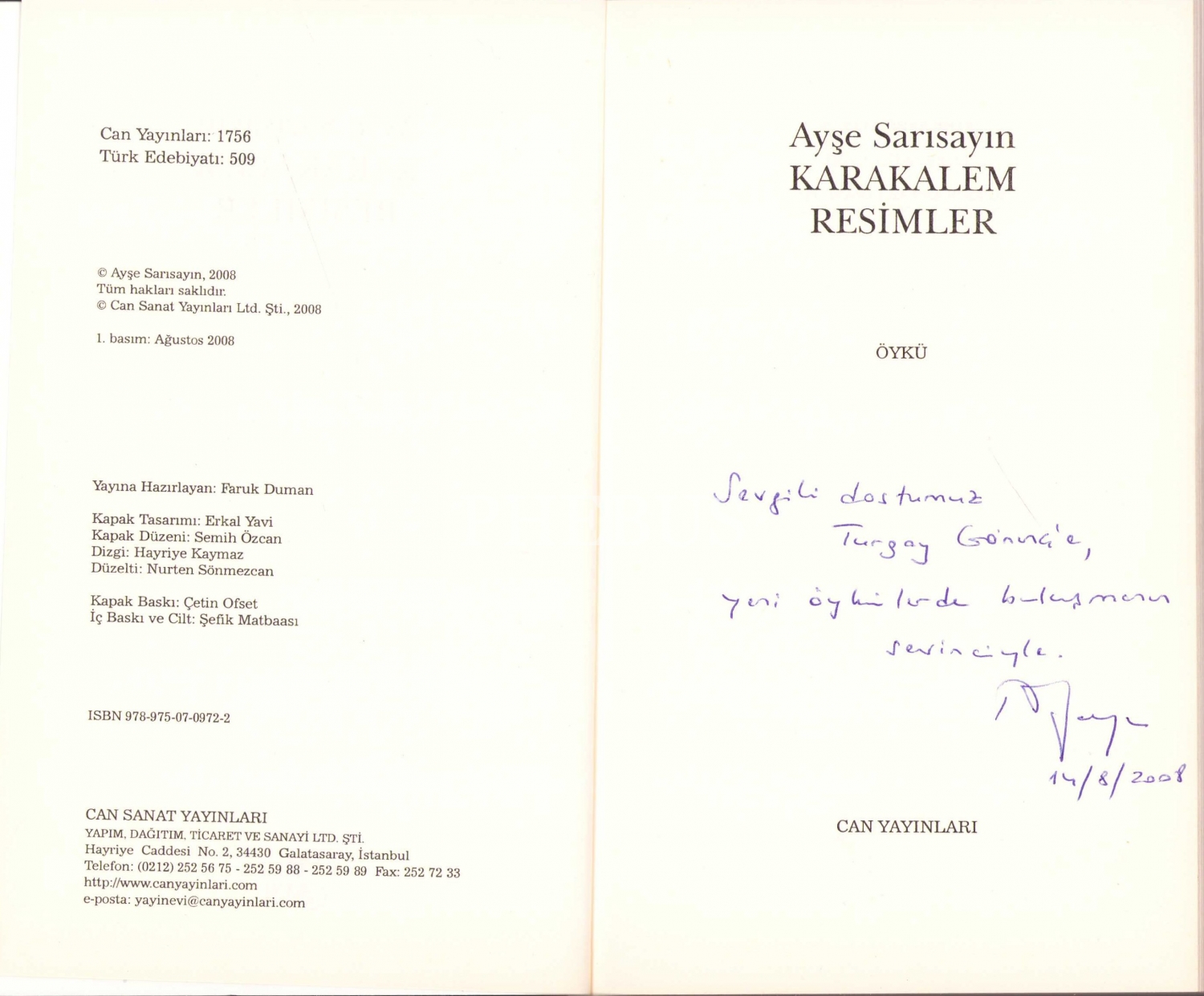 Karakalem Resimler -Öykü-, Ayşe Sarısayın'dan imzalı ve ithaflı, 2008, 129 sayfa