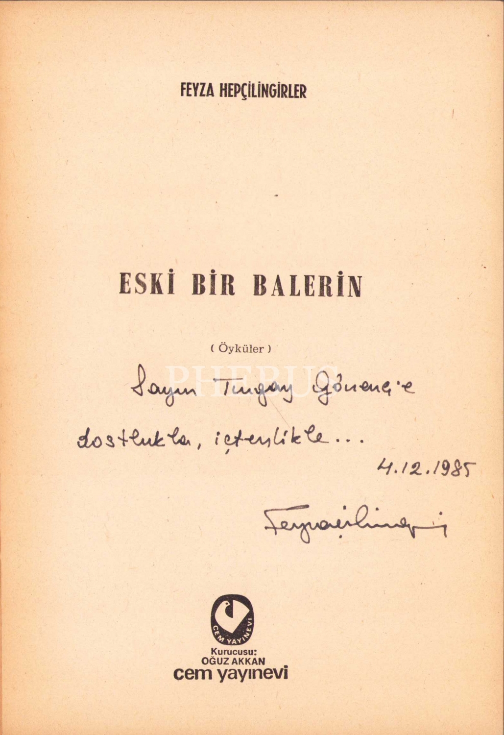 İthaf "Sayın Turgay Gönenç'e dostlukla, içtenlikle. 4.12.1985" şeklindedir