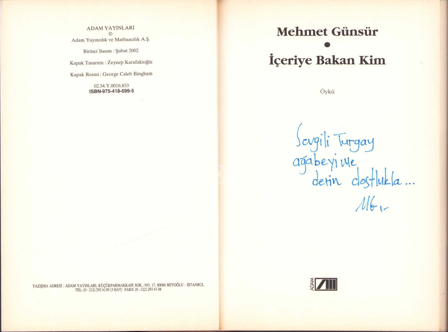 İçeriye Bakan Kim -Öykü, Mehmet Günsür'den imzalı ve ithaflı, 2002, 93 sayfa
