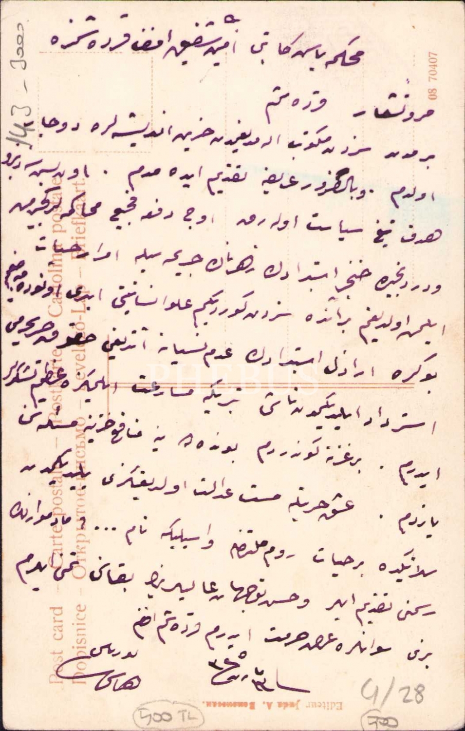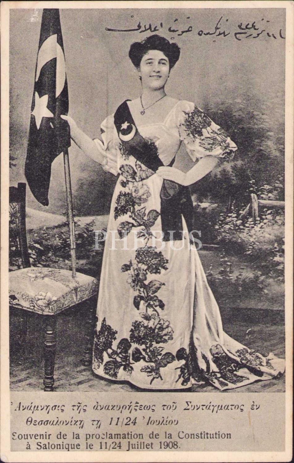 11 Temmuz 1324 Selanik'te Hürriyetin İlanı, 2. Meşrutiyet konulu 3 dilde kartpostal, arkası mahkeme başkatibi Emin Bey'e gönderilmiş istibdat konulu, 1325 tarihli Osmanlıca mektup