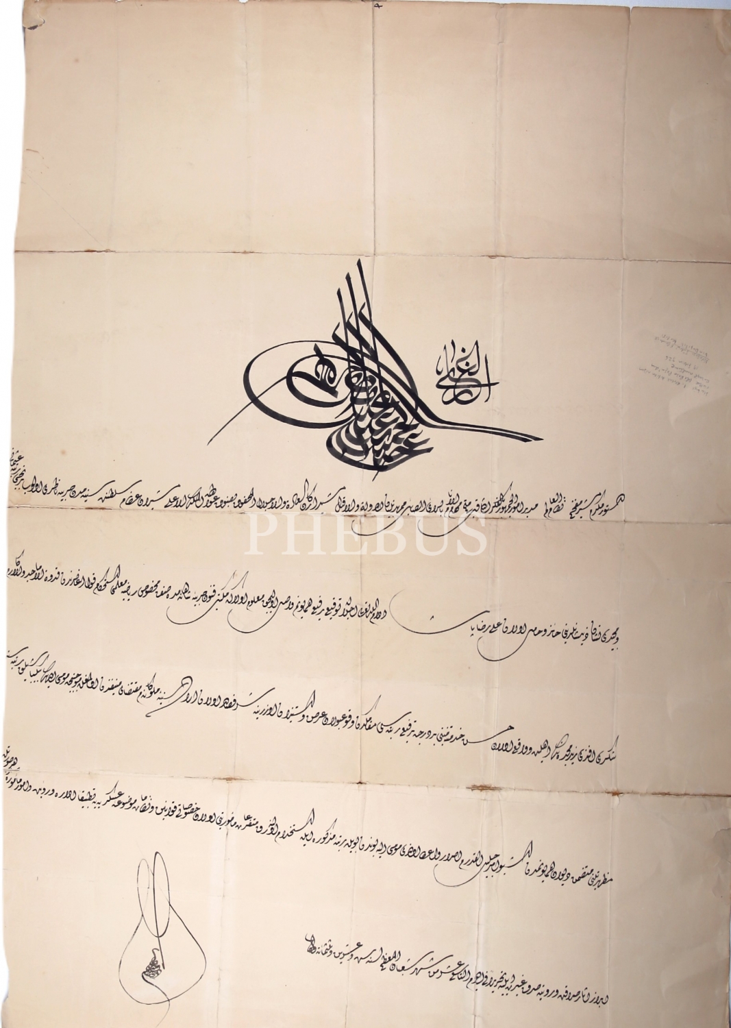 Abdülhamit tuğralı, 1326 senesinde Riyaziye muallimi kolağası Şükrü Efendiye binbaşılık rütbesine terfi etmesi konulu Osmanlıca ferman, haliyle, 57x80 cm