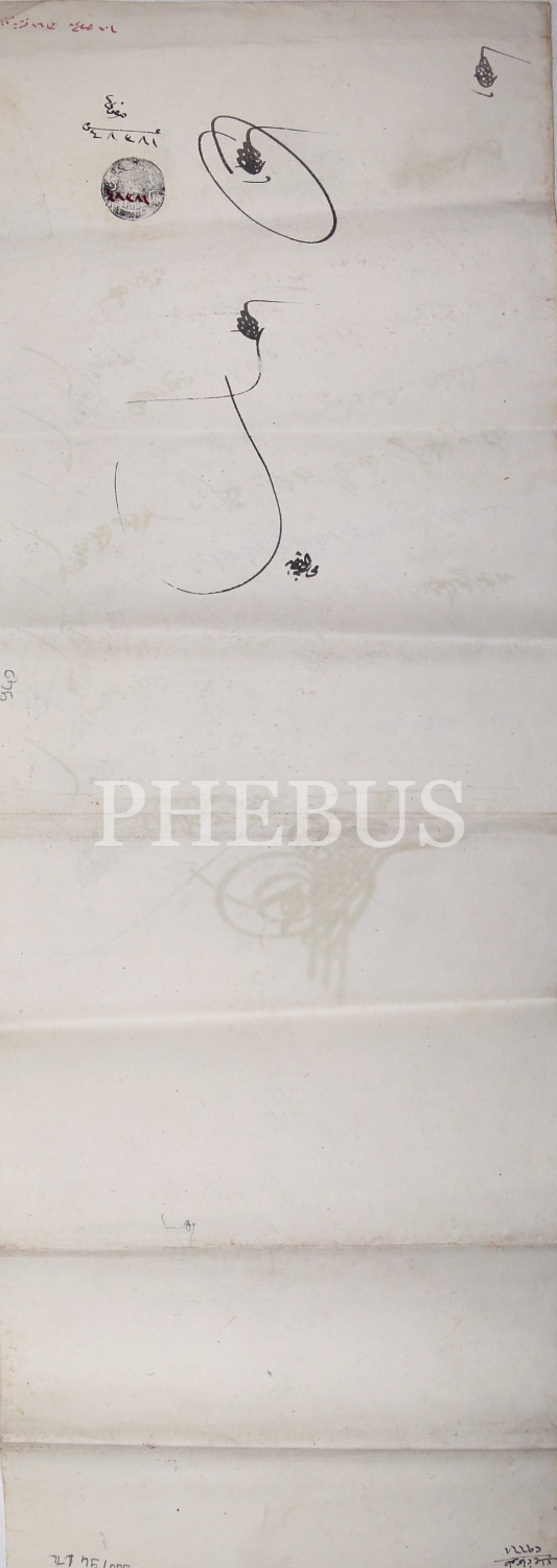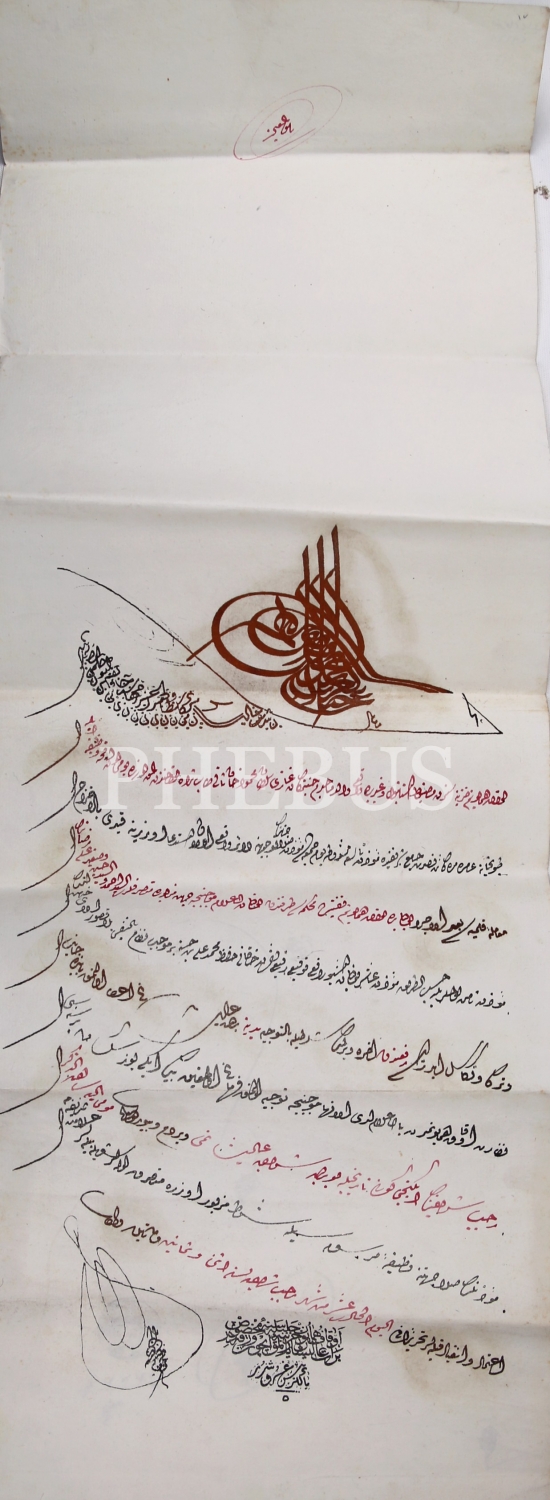 Abdülaziz tuğralı, 1281 senesinde Tophane Nusretiye Camii Şerife müezzin atanması ve maaşlar hakkındaki Osmanlıca berat, 27x80 cm