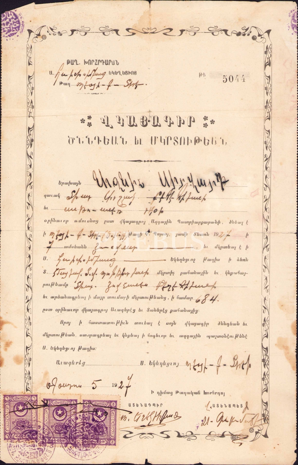 Ermenice 1927 tarihli doğum kağıdı, haliyle, 19x30 cm