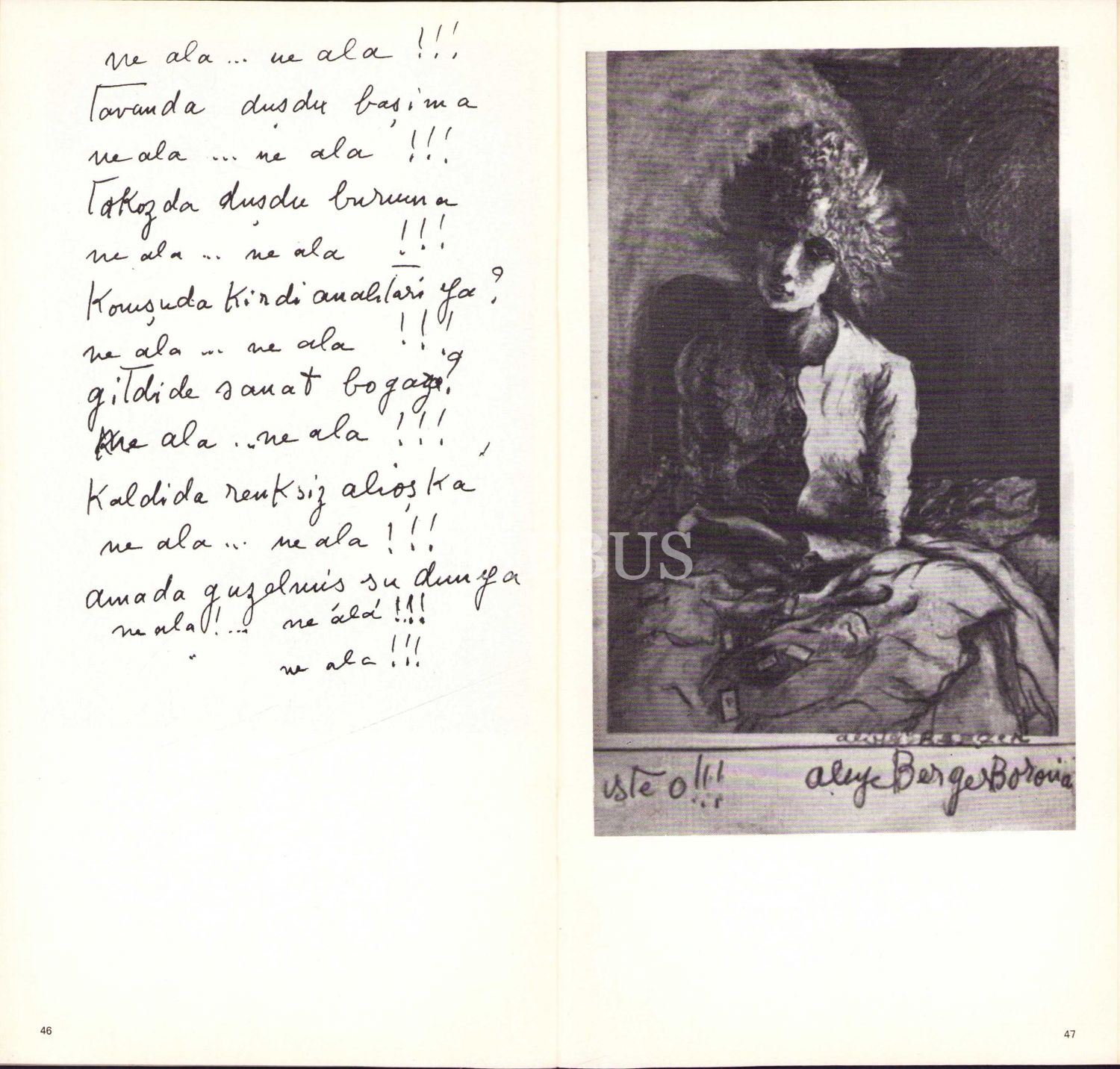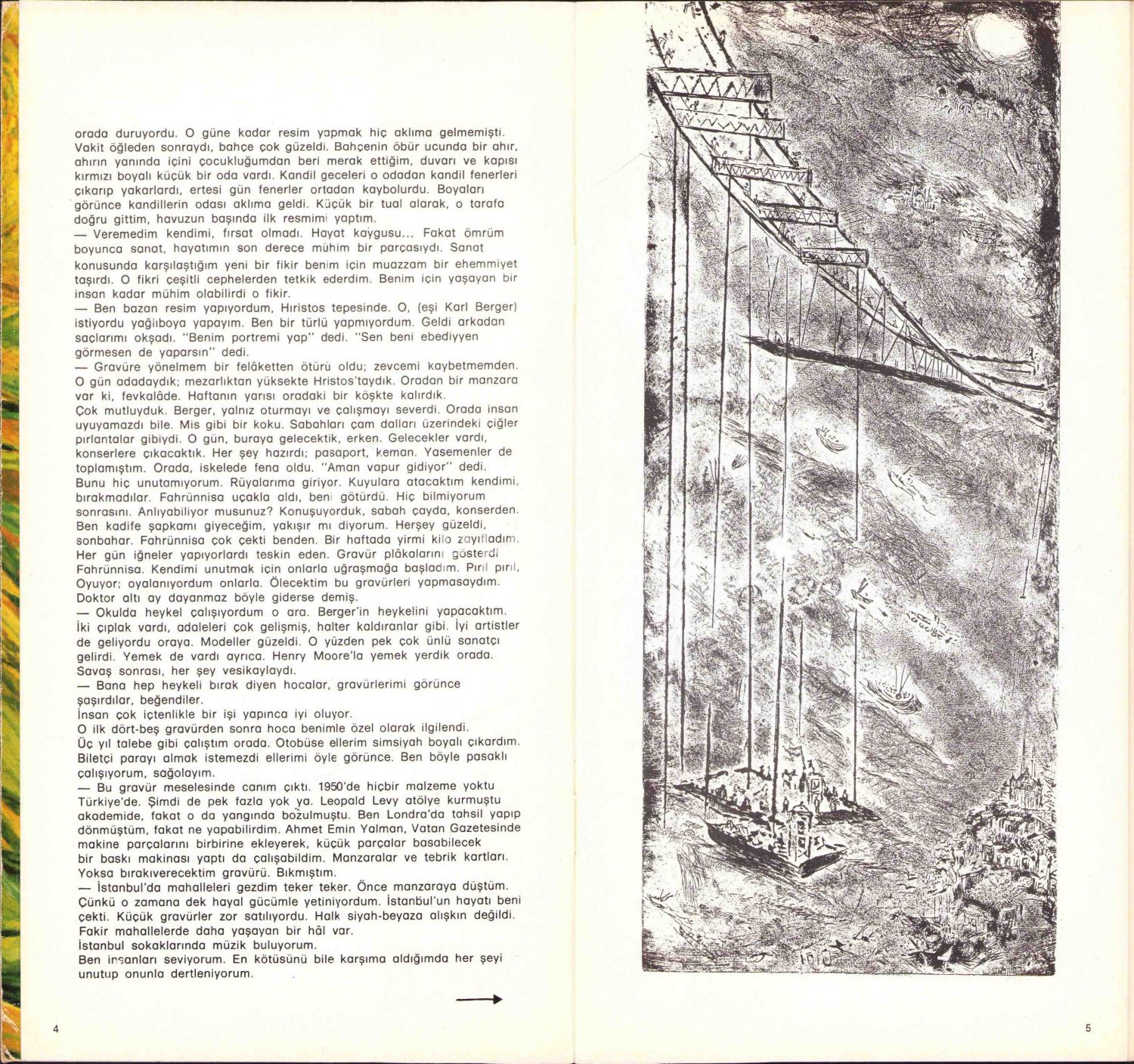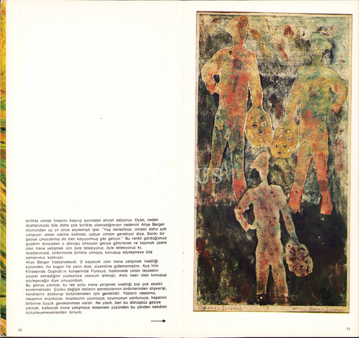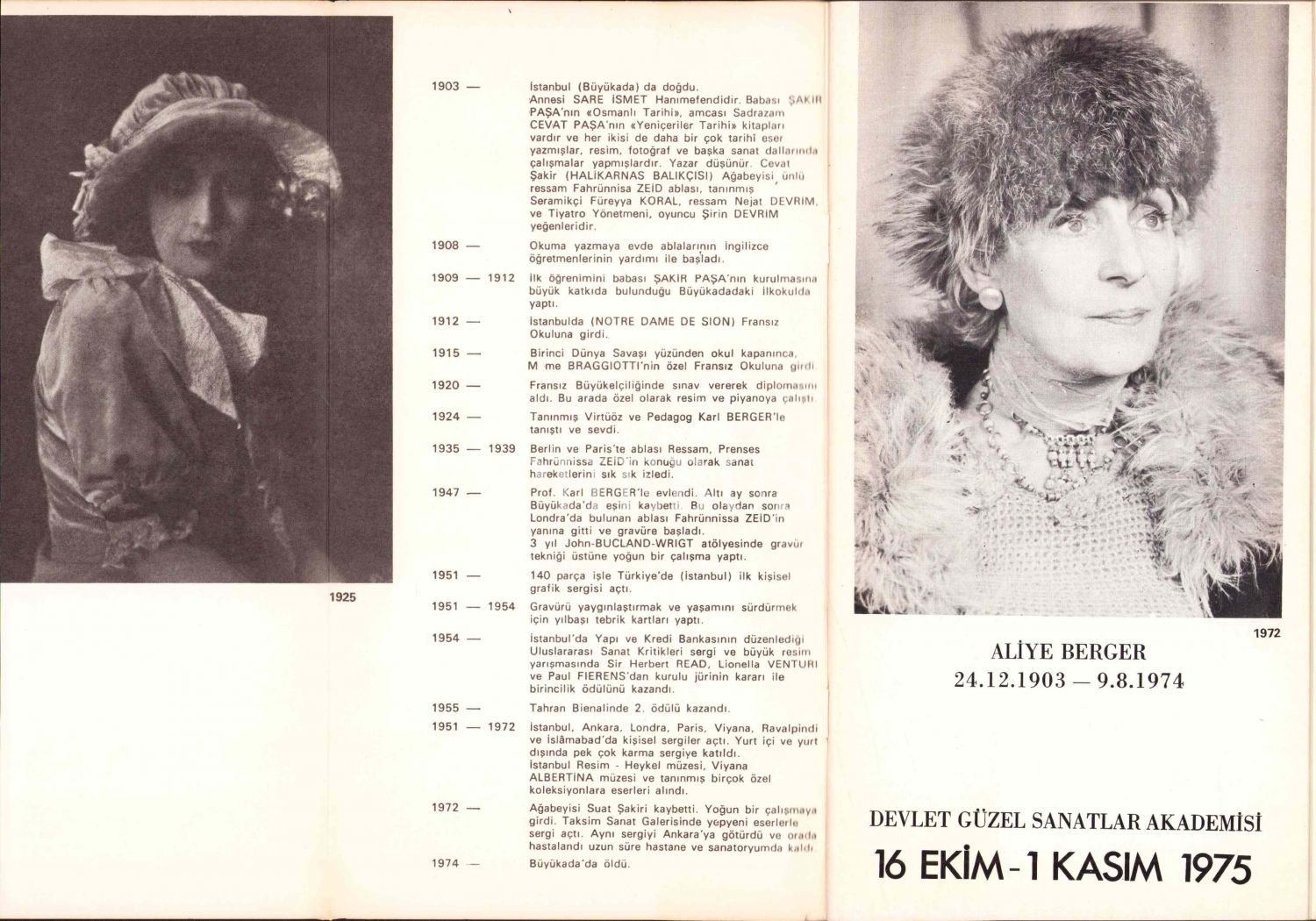 Türkiye'nin ilk kazıma ve oyma gravür sanatçılarından Aliye Berger'in Devlet Güzel Sanatlar Akademisi tarafından 1975 yılında düzenlenen sergi kataloğu, 47 sayfa, 13x24 cm