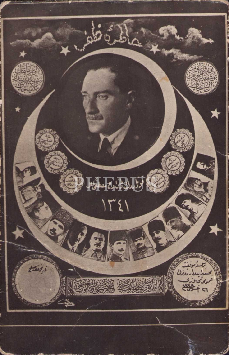 Kurtuluş Savaşı anısına basılan Hatıra-i Zafer kartpostalı, Gazi Mustafa Kemal Atatürk ve silah arkadaşları, 1341 tarihli, iki kenarı kırık, haliyle