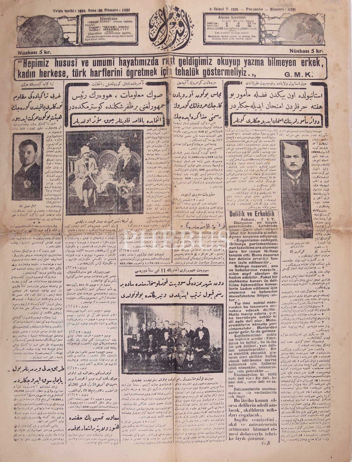 Gazetede Atatürk'ün yeni alfabe konusuna verdiği ehemmiyeti manşet olarak yazılmıştır: "Hepimiz Hususi ve Umumi Hayatımızda Rahat Geldiğimiz Okuyup Yazma Bilmeyen Erkek, Kadın Herkese, Türk Harflerini Öğretmek İçin Tehalük Göstermeliyiz. G.M.K.", diğer başlıklar; "Amerika'da Emsali Görülmemiş Bir İntihabat: Hoover'in Reisi Cumhurluğunu Bir Zafer Şeklinde Göstermektedir". 4 sayfa, 46x58 cm