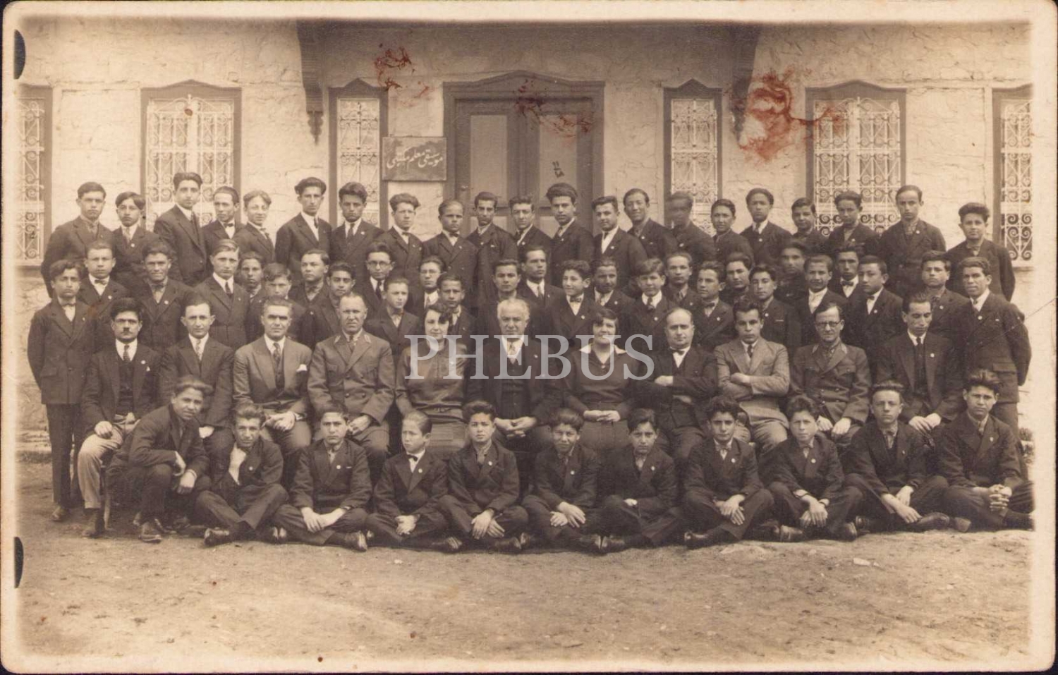 Musiki Muallim Mektebi tabelası önünde, Veli Kanık, İstiklal Marşı'nın Bestecisi Osman Zeki Üngör, muallim ve talebeler